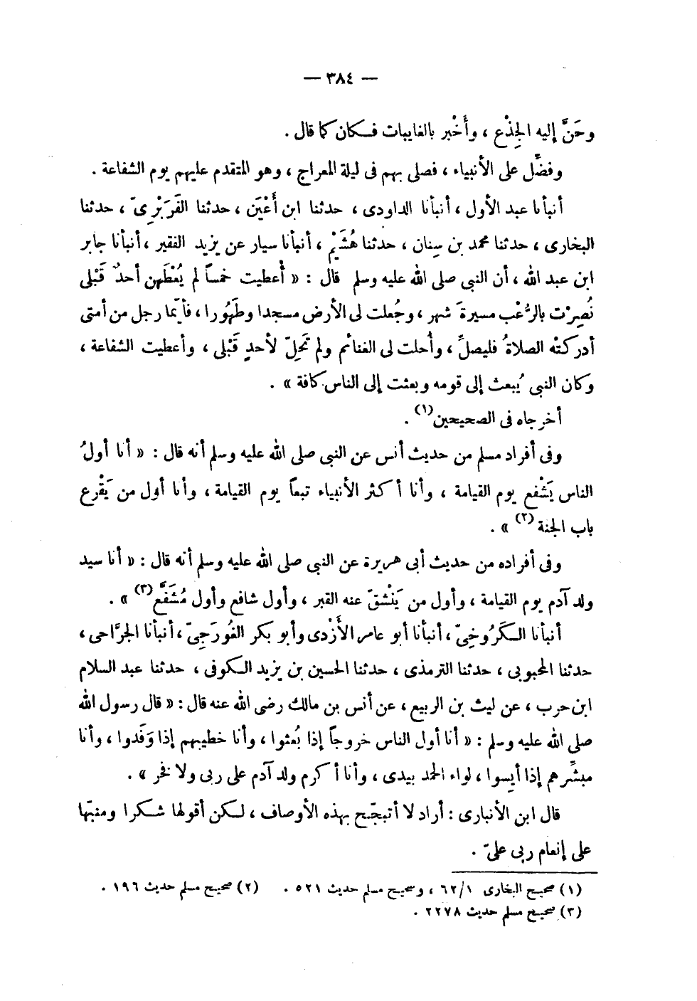 | | وحن إليه الجذع , وأخبر بالغايبات فكان كما قال . | | وفضل على الأنبياء , فصلى بهم في ليلة المعراج , وهو المتقدم عليهم يوم الشفاعة . | | أنبأنا عبد الأول , أنبأنا الداودي , حدثنا ابن أعين , حدثنا الفربري , حدثنا | البخاري , حدثنا محمد بن سنان , حدثنا هشيم , أنبأنا سيار عن يزيد الفقير , أنبأنا جابر | ابن عبد الله , أن النبي صلى الله عليه وسلم قال : ' أعطيت خمساً لم يعطهن أحد قبلي | نصرت بالرعب مسيرة شهر , وجعلت لي الأرض مسجداً وطهوراً , فأيما رجل من أمتي | أدركته الصلاة فليصل , وأحلت لي الغنائم ولم تحل لأحد قبلي , وأعطيت الشفاعة , | وكان النبي يبعث إلى قومه وبعثت إلى الناس كافة ' . | | أخرجاه في الصحيحين . | | وفي أفراد مسلم من حديث أنس عن النبي صلى الله عليه وسلم أنه قال : ' أنا أول | الناس يشفع يوم القيامة , وأنا أكثر الأنبياء تبعاً يوم القيامة , وأنا أول من يقرع | باب الجنة ' . | | وفي أفراده من حديث أبي هريرة عن النبي صلى الله عليه وسلم أنه قال : ' أنا سيد | ولد آدم يوم القيامة , وأول من ينشق عنه القبر , وأول شافع وأول مشفع ' . | | أنبأنا الكروخي , أنبأنا أبو عامر الأزدي وأبو بكر الغورجي , أنبأنا الجراحي , | حدثنا المحبوبي , حدثنا الترمذي , حدثنا الحسين بن يزيد الكوفي , حدثنا عبد السلام | ابن حرب , عن ليث بن الربيع , عن أنس بن مالك رضي الله عنه قال : ' قال رسول الله صلى الله عليه وسلم : | ' أنا أول الناس خروجاً إذا بعثوا , وأنا خطيبهم إذا وفدوا , وأنا | مبشرهم إذا أيسوا , لواء الحمد بيدي , وأنا أكرم ولد آدم على ربي ولا فخر ' . | | قال ابن الأنباري : أراد لا أتبجح بهذه الأوصاف , لكن أقولها شكراً ومنبها | على إنعام ربي علي . |