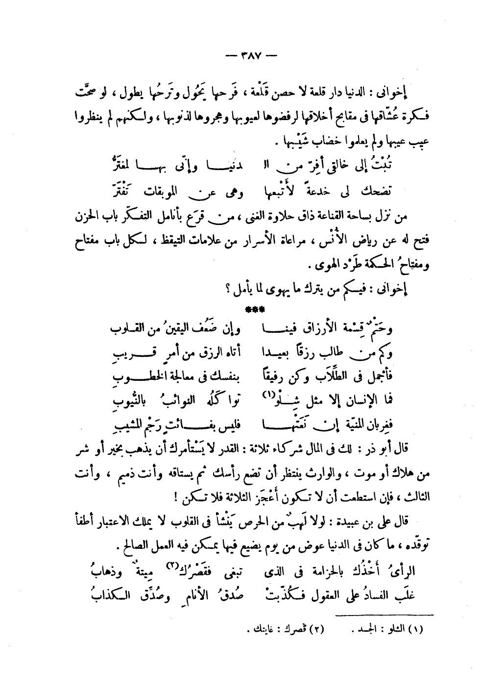 | | إخواني : الدنيا دار قلعة لا حصن قلعة , فرحها يحول وترحها يطول , لو صحت | فكرة عشاقها في مقابح أخلاقها لرفضوها لعيوبها وهجروها لذنوبها , ولكنهم لم ينظروا | عيب عيبها ولم يعلموا خضاب شيبها . | | ( تبت إلى خالقي أفر من الدنيا % وإني بها لمغتر ) % | | ( تضحك لي خدعة لأتبعها % وهي عن الموبقات تفتر ) % | | من نزل بساحة القناعة ذاق حلاوة الغنى , من قرع بأنامل التفكر باب الحزن | فتح له عن رياض الأنس , مراعاة الأسرار من علامات التيقظ , لكل باب مفتاح | ومفتاح الحكمة طرد الهوى . | | إخواني : فيكم من يترك ما يهوى لما يأمل ؟ | | ( وحتم قسمة الأرزاق فينا % وإن ضعف اليقين من القلوب ) % | | ( وكم من طالب رزقاً بعيداً % أتاه الرزق من أمر قريب ) % | | ( فأجمل في الطلاب وكن رفيقاً % بنفسك في معالجة الخطوب ) % | | ( فما الإنسان إلا مثل شلو % تواكله النوائب بالنيوب ) % | | ( فغربان المنية إن نعتها % فليس بفائت رجم المشيب ) % | | قال أبو ذر : لك في المال شركاء ثلاثة : القدر لا يستأمرك أن يذهب بخير أو شر | من هلاك أوموت , والوارث ينتظر أن تضع رأسك ثم يستاقه وأنت ذميم , وأنت | الثالث , فإن استطعت أن لا تكون أعجز الثلاثة فلا تكن ! | | قال علي بن عبيدة : لولا لهب من الحرص ينشأ في القلوب لا يملك الاعتبار أطفأ | توقده , ما كان في الدنيا عوض من يوم يضيع فيها يمكن فيه العمل الصالح . | | ( الرأي أخذك بالحزامة في الذي % تبغي فقصرك ميتة وذهاب ) % | | ( غلب الفساد على العقول فكذبت % صدق الأنام وصدق الكذاب ) % |