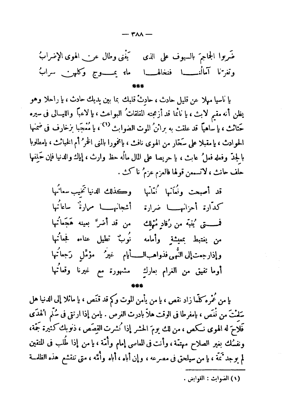 | | ( ضربوا الجماجم بالسيوف على الذي % يفنى وطال عن الهوى الإضراب ) % | | ( وتغرنا آمالنا فنخالها % ماء يموج وكلهن سراب ) % | | يا ناسياً مهلاً عن قليل حادث , حادث قلبك بما بين يديك حادث , يا راحلاً وهو | يظن أنه مقيم لابث , يا نائماً قد أزعجته المقلقات البواعث , يا لاعباً والليالي في سيره | حثائث , يا ساهياً قد علقت به براثن الموت الضوابث , يا معجباً بزخارف في ضمنها | الحوادث , يا مقبلاً على سحار من الهوى نافث , يا مخموراً بالمنى الخمر أم الخبائث , يا مطلوباً | بالجد وفعله فعل عابث , يا حريصاً على المال ماله حظ وارث , إياك والدنيا فإن حلفها | حلف حانث , لا تسمعن قولها فالعزم عزم ناكث . | | ( قد أصبحت ونعاتها نعاتها % وكذلك الدنيا تخيب سعاتها ) % | | ( كدارة أحزانها ضرارة % أشجانها مرارة ساعاتها ) % | | ( فمتى ينبه من رقاد مهلك % من قد أضر بعينه هجعاتها ) % | | ( من يغتبط بمعيشة وأمامه % نوب تطيل عناءه فجعاتها ) % | | ( وإذا رجعت إلى النهى فذواهب الأيام % غير مؤمل رجعاتها ) % | | ( أوما تفيق من الغرام بعارك % مشهورة مع غيرنا وقعاتها ) % | | يا من عمره كلما زاد نقص , يا من يأمن الموت وكم قد قنص , يا مائلاً إلى الدنيا هل | سلمت من نغص , يا مفرطاً في الوقت هلا بادرت الفرص . يا من إذا ارتقى في سلم الهدى | فلاح له الهوى نكص , من لك يوم الحشر إذا نشرت القصص , ذنوبك كثيرة جمة , | ونفسك بغير الصلاح مهتمة , وأنت في المعاصي إمام وأمة , يا من إذا طلب في المتقين | لم يوجد ثمة , يا من سيلحق في مصرعه , وإن أباه , أباه وأمه , متى تنقشع هذه الظلمة |