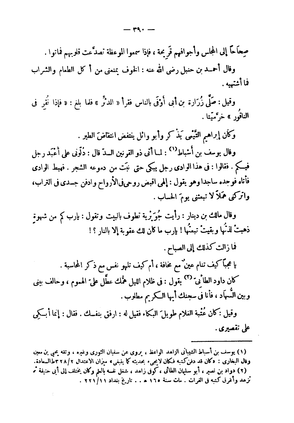| صحاحاً إلى المجلس وأجوافهم قريحة , فإذا سمعوا الموعظة تصدعت قلوبهم فماتوا . | | وقال أحمد بن حنبل رضي الله عنه : الخوف يمنعني من أكل الطعام والشراب | | فما أشتهيه . | | وقيل : صلى زرارة بن أبي أوفى بالناس فقرأ ' المدثر ' فلما بلغ : ! 2 < فإذا نقر في الناقور > 2 ! خر ميتاً . | | وكان إبراهيم التيمي يذكر وأبو وائل ينتفض انتفاض الطير . | | وقال يوسف بن أسباط : لما أتى ذو القرنين السد قال : دلوني على أعبد رجل | فيكم . فقالوا : في هذا الوادي رجل يبكي حتى نبت من دموعه الشجر . فهبط الوادي | فأتاه فوجده ساجداً وهو يقول : إلهي اقبض روحي في الأوراح وادفن جسدي في التراب , | واتركني هملاً لا تبعثني يوم الحساب . | | وقال مالك بن دينار : رأيت جويرية تطوف بالبيت وتقول : يا رب كم من شهوة , | ذهبت لذتها وبقيت تبعتها ! يا رب ما كان لك عقوبة إلا بالنار ؟ ! | | فما زالت كذلك إلى الصباح . | | يا عجباً تنام عين مع مخافة , أم كيف تلهو نفس مع ذكر المحاسبة . | | كان داود الطائي يقول : في ظلام الليل همك عطل على الهموم , وحالف بيني | وبين السهاد , فأنا في سجنك أيها الكريم مطلوب . | | وقيل : كان عتبة الغلام طويل البكاء فقيل له : ارفق بنفسك . فقال : إنما أبكي | على تقصيري . |
