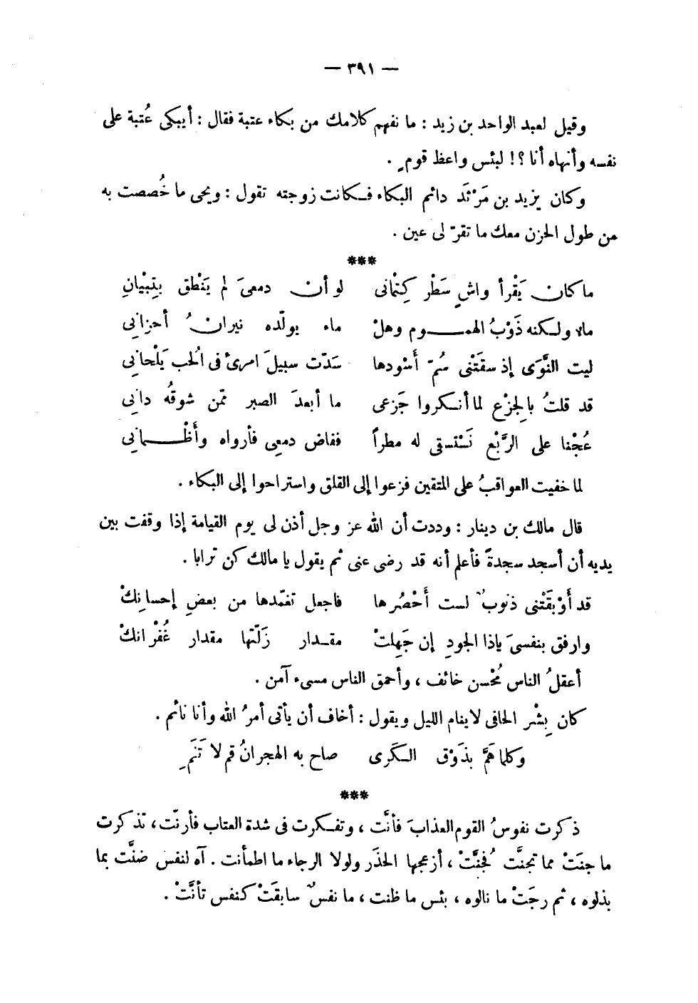 | | وقيل لعبد الواحد بن زيد : ما نفهم كلامك من بكاء عتبة فقال : أيبكي عتبة على | نفسه وأنهاه أنا ؟ ! لبئس واعظ قوم . | | وكان يزيد بن مرثد دائم البكاء فكانت زوجته تقول : ويحي ما خصصت به | من طول الحزن معك ما تقر لي عين . | | ( ما كان يقرأ واش سطر كتماني % لو أن دمعي لم ينطق بتبيان ) % | | ( ماء ولكنه ذوب الهموم وهل % ماء يولده نيران أحزاني ) % | | ( ليت النوى إذ سقتني سم أسودها % سدت سبيل امرئ في الحب يلحاني ) % | | ( قد قلت بالجزع لما أنكروا جزعي % ما أبعد الصبر ممن شوقه داني ) % | | ( عجناً على الربع نستسقي له مطراً % ففاض دمعي فأرواه وأظماني ) % | | لما خفيت العواقب على المتقين فزعوا إلى القلق واستراحوا إلى البكاء . | | قال مالك بن دينار : وددت أن الله عز وجل أذن لي يوم القيامة إذا وقفت بين | يديه أن أسجد سجدة فأعلم أنه قد رضي عني ثم يقول يا مالك كن تراباً . | | ( قد أوبقتني ذنوب لست أحصرها % فاجعل تغمدها من بعض إحسانك ) % | | ( وارفق بنفسي يا ذا الجود إن جهلت % مقدار زلتها مقدار غفرانك ) % | | أعقل الناس محسن خائف , وأحمق الناس مسيء آمن . | | كان بشر الحافي لا ينام الليل ويقول : أخاف أن يأتي أمر الله وأنا نائم . | | ( وكلما هم بذوق الكرى % صاح به الهجران قم لا تنم ) % | | ذكرت نفوس القوم العذاب فأنت , وتفكرت في شدة العتاب فأرنت , تذكرت | ما جنت مما تجنت فجنت , أزعجها الحذر ولولا الرجاء ما اطمأنت . آه لنفس ضنت بما | بذلوه , ثم رجت ما نالوه , بئس ما ظنت , ما نفس سابقت كنفس تأنت . |