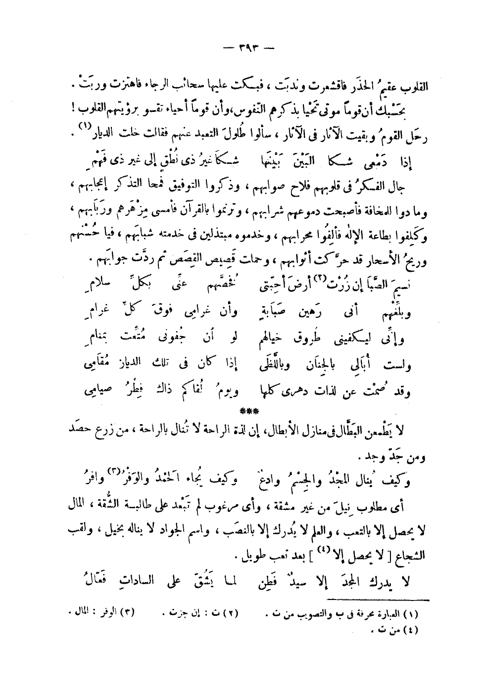 | القلوب عقيم الحذر فاقشعرت وندبت , فبكت عليها سحائب الرجاء فاهتزت وربت . | | بحسبك أن قوماً موتى تحيا بذكرهم النفوس , وأن قوماً أحياء تقسو برؤيتهم القلوب ! | رحل القوم وبقيت الآثار في الآثار , سألوا طلول التعبد عنهم فقالت خلت الديار . | | ( إذا دمعي شكا البين بينها % شكا غير ذي نطق إلى غير ذي فهم ) % | | جال الفكر في قلوبهم فلاح صوابهم , وذكروا التوفيق فمحا التذكر إعجابهم , | وما دوا للمخافة فأصبحت دموعهم شرابهم , وترنموا بالقرآن فأمسى مزهرهم وربابهم , | وكلفوا بطاعة الإله فألفوا محرابهم , وخدموه مبتذلين في خدمته شبابهم , فيا حسنهم | وريح الأسحار قد حركت أثوابهم , وحملت قصيص القصص ثم ردت جوابهم . | | ( نسيم الصبا إن زرت أرض أحبتي % فخصهم عني بكل سلام ) % | | ( وبلغهم أني رهين صبابة % وأن غرامي فوق كل غرام ) % | | ( وإني ليكفيني طروق خيالهم % لو أن جفوني متعت بمنام ) % | | ( ولست أبالي بالجنان وباللظى % إذا كان في تلك الديار مقامي ) % | | ( وقد صمت عن لذات دهري كلها % ويوم لقاكم ذاك فطر صيامي ) % | | لا يطمعن البطال في منازل الأبطال , إن لذة الراحة لا تنال بالراحة , من زرع حصد | ومن جد وجد . | | ( وكيف ينال المجد والجسم وادع % وكيف يجاء الحمد والوفر وافر ) % | | أي مطلوب نيل من غير مشقة , وأي مرغوب لم تبعد على طالبة الشقة , المال | لا يحصل إلا بالتعب , والعلم لا يدرك إلا بالنصب , واسم الجواد لا يناله بخيل , ولقب | الشجاع [ لا يحصل إلا ] بعد تعب طويل . | | ( لا يدرك المجد إلا سيد فطن % لما يشق على السادات فعال ) % . |