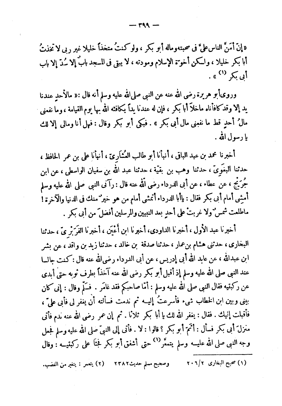 | | ' إن أمن الناس علي في صحبته وماله أبو بكر , ولو كنت متخذا خليلا غير ربي لاتخذت | أبا بكر خليلا , ولكن أخوة الإسلام ومودته , لا يبقى في المسجد باب إلا سد إلا باب | أبي بكر ' . | | وروى أبو هريرة رضي الله عنه عن النبي صلى الله عليه وسلم أنه قال : ' ما لأحد عندنا | يد إلا وقد كافأناه ما خلا أبا بكر , فإنه له عندنا يدا يكافئه الله بها يوم القيامة , وما نفعني | مال أحد قط ما نفعني مال أبي بكر ' . فبكى أبو بكر وقال : فهل أنا ومالي إلا لك | يا رسول الله . | | أخبرنا محمد بن عبد الباقي , أنبأنا أبو طالب العشاري , أنبأنا علي بن عمر الحافظ , | حدثنا البغوي , حدثنا وهب بن بقية , حدثنا عبد الله بن سفيان الواسطي , عن ابن | جريج , عن عطاء , عن أبي الدرداء رضي الله عنه قال : رآني النبي صلى الله عليه وسلم | أمشي أمام أبي بكر فقال : يا أبا الدرداء أتمشي أمام من هو خير منك في الدنيا والآخرة ! | ما طلعت شمس ولا غربت على أحد بعد النبيين والمرسلين أفضل من أبي بكر . | | أخبرنا عبد الأول , أخبرنا الداودي , أخبرنا ابن أعين ، أخبرنا الفربري , حدثنا | البخاري , حدثني هشام بن عمار , حدثنا صدقة بن خالد , حدثنا زيد بن واقد , عن بشر | ابن عبد الله , عن عابد الله أبي إدريس , عن أبي الدرداء رضي الله عنه قال : كنت جالسا | عند النبي صلى الله عليه وسلم إذ أقبل أبو بكر رضي الله عنه آخذا بطرف ثوبه حتى أبدى | عن ركبتيه فقال النبي صلى الله عليه وسلم : أما صاحبكم فقد غامر . فسلم وقال : إني كان | بيني وبين ابن الخطاب شيء فأسرعت إليه ثم ندمت فسألته أن يغفر لي فأبى علي , | فأقبلت إليك . فقال : يغفر الله لك يا أبا بكر ثلاثا . ثم إن عمر رضي الله عنه ندم فأتى | منزل أبي بكر فسأل : أثم أبو بكر ؟ فقالوا : لا . فأتى إلى النبي صلى الله عليه وسلم فجعل | وجه النبي صلى الله عليه وسلم يتمعر حتى أشفق أبو بكر فجثا على ركبتيه : وقال |