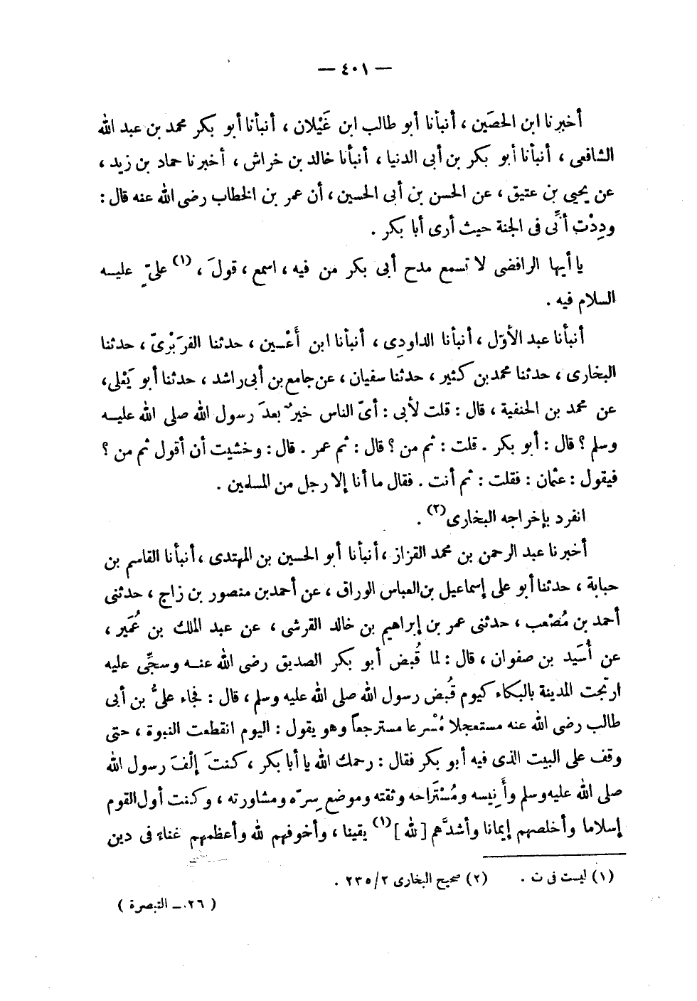 | | أخبرنا ابن الحصين , أنبأنا أبو طالب ابن غيلان , أنبأنا أبو بكر محمد بن عبد الله | الشافعي , أنبأنا أبو بكر بن أبي الدنيا , أنبأنا خالد بن خراش , أخبرنا حماد بن زيد , | عن يحيى بن عتيق , عن الحسن بن أبي الحسين , أن عمر بن الخطاب رضي الله عنه قال : | وددت أني في الجنة حيث أرى أبا بكر . | | يا أيها الرافضي لا تسمع مدح أبي بكر من فيه , اسمع , قول ، علي عليه | السلام فيه . | | أنبأنا عبد الأول , أنبأنا الداودي , أنبأنا ابن أعين , حدثنا الفربري , حدثنا | البخاري , حدثنا محمد بن كثير , حدثنا سفيان , عن جامع بن أبي راشد , حدثنا أبو يعلى , | عن محمد بن الحنفية , قال : قلت لأبي : أي الناس خير بعد رسول الله صلى الله عليه وسلم ؟ | قال : أبو بكر . قلت : ثم من ؟ قال : ثم عمر . قال : وخشيت أن أقول ثم من ؟ | فيقول : عثمان . فقلت : ثم أنت . فقال ما أنا إلا رجل من المسلمين . | | انفرد بإخراجه البخاري . | | أخبرنا عبد الرحمن بن محمد القزاز , أنبأنا أبو الحسين بن المهتدي , أنبأنا القاسم بن | حبابة , حدثنا أبو علي إسماعيل بن العباس الوراق , عن أحمد بن منصور بن زاج , حدثني | أحمد بن مصعب , حدثني عمر بن إبراهيم بن خالد القرشي , عن عبد الملك بن عمير , | عن أسيد بن صفوان , قال : لما قبض أبو بكر الصديق رضي الله عنه وسجى عليه | ارتجت المدينة بالبكاء كيوم قبض رسول الله صلى الله عليه وسلم , قال : فجاء علي بن أبي | طالب رضي الله عنه مستعجلاً مسرعاً مسترجعاً وهو يقول : اليوم انقطعت النبوة , حتى | وقف على البيت الذي فيه أبو بكر فقال : رحمك الله يا أبا بكر , كنت إلف رسول الله | صلى الله عليه وسلم وأنيسه ومستراحه وثقته وموضع سره ومشاورته , وكنت أول القوم | إسلاماً وأخلصهم إيماناً وأشدهم [ لله ] يقيناً , وأخوفهم لله وأعظمهم غناء في دين |