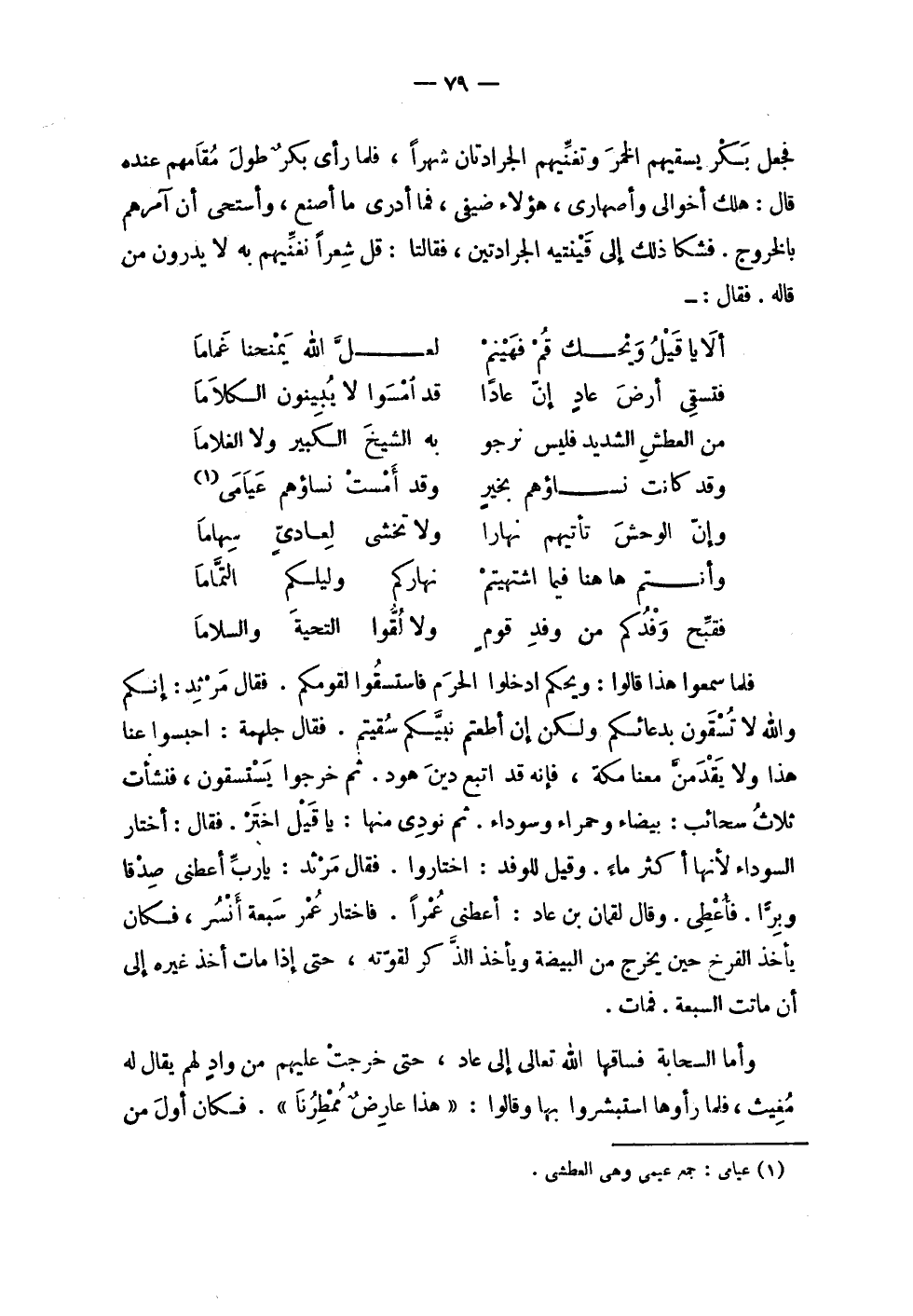 | فجعل بكر يسقيهم الخمر وتغنيهم الجرادتان شهراً , فلما رأى بكر طول مقامهم عنده | قال : هلك أخوالي وأصهاري , هؤلاء ضيفي , فما أدري ما أصنع , وأستحي أن آمرهم | بالخروج . فشكا ذلك إلى قينتيه الجرادتين , فقالتا : قل شعراً تغنيهم به لا يدرون من | قاله . فقال : | | ( ألا يا قيل ويحك قم فهينم % لعل الله يمنحنا غماما ) % | | ( فتسقي أرض عاد إن عاداً % قد أمسوا لا يبينون الكلاما ) % | | ( من العطش الشديد فليس نرجو % به الشيخ الكبير ولا الغلاما ) % | | ( وقد كانت نساؤهم بخير % وقد أمست نساؤهم عيامى ) % | | ( وإن الوحش تأتيهم نهارا % ولا تخشى لعادي سهاما ) % | | ( وأنتم ها هنا فيما اشتهيتم % نهاركم وليلكم التماما ) % | | ( فقبح وفدكم من وفد قوم % ولا لقوا التحية والسلاما ) % | | فلما سمعوا هذا قالوا : ويحكم ادخلوا الحرم فاستسقوا لقومكم . فقال مرثد : إنكم | والله لا تسقون بدعائكم ولكن إن أطعتم نبيكم سقيتم . فقال جلهمة : احبسوا عنا | هذا ولا يقدمن معنا مكة , فإنه قد اتبع دين هود . ثم خرجوا يستسقون , فنشأت | ثلاث سحائب : بيضاء وحمراء وسوداء . ثم نودي منها : يا قيل اختر . فقال : أختار | السوداء لأنها أكثر ماء . وقيل للوفد : اختاروا . فقال مرثد : يا رب أعطني صدقا | وبرا . فأعطي . وقال لقمان بن عاد : أعطني عمراً . فاختار عمر سبعة أنسر , فكان | يأخذ الفرخ حين يخرج من البيضة ويأخذ الذكر لقوته , حتى إذا مات أخذ غيره إلى | أن ماتت السبعة . فمات . | | وأما السحابة فساقها الله تعالى إلى عاد , حتى خرجت عليهم من واد لهم يقال له | مغيث , فلما رأوها استبشروا بها وقالوا : ! 2 < هذا عارض ممطرنا > 2 ! . فكان أول من |