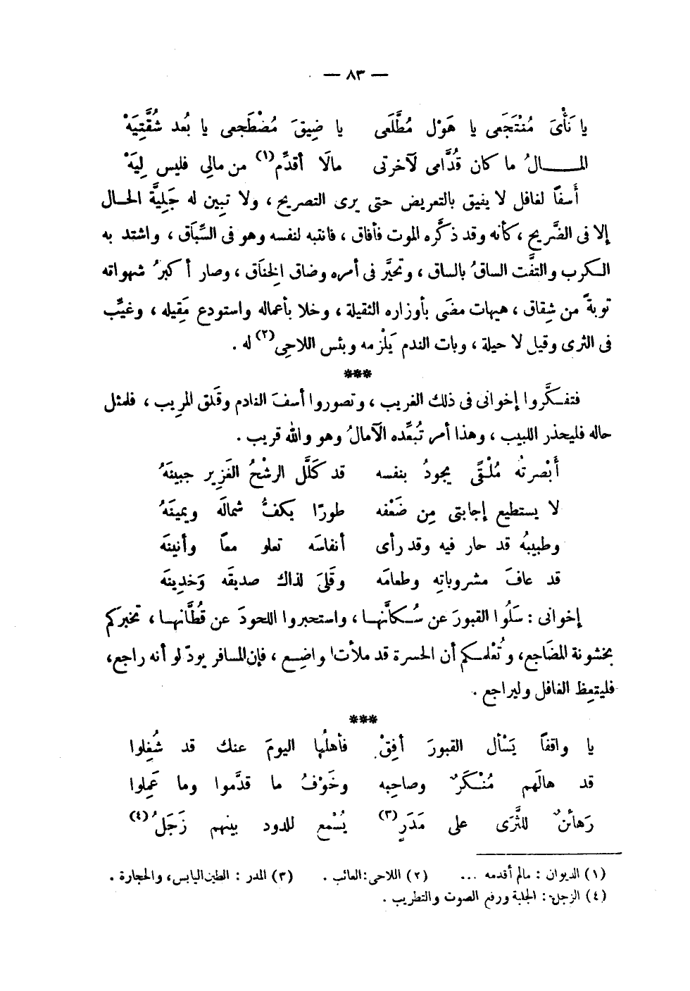| | ( يا نأي منتجعي يا هول مطلعي % يا ضيق مضطجعي يا بعد شقتيه ) % | | ( المال ما كان قدامي لآخرتي % ما لا أقدم من مالي فليس ليه ) % | | أسفا لغافل لا يفيق بالتعريض حتى يرى التصريح , ولا تبين له جلية الحال | إلا في الضريح , كأنه وقد ذكره الموت فأفاق , فانتبه لنفسه وهو في السباق , واشتد به | الكرب والتفت الساق بالساق , وتحير في أمره وضاق الخناق , وصار أكبر شهواته | توبة من شقاق , هيهات مضى بأوزاره الثقيلة ، وخلا بأعماله واستودع مقيله , وغيب | في الثرى وقيل لا حيلة , وبات الندم يلزمه وبئس اللاحي له . | | فتفكروا إخواني في ذلك الغريب , وتصوروا أسف النادم وقلق المريب , فلمثل | حاله فليحذر اللبيب , وهذا أمر تبعده الآمال وهو والله قريب . | | ( أبصرته ملقى يجود بنفسه % قد كلل الرشح الغزير جبينه ) % | | ( لا يستطيع إجابتي من ضعفه % طوراً يكف شماله ويمينه ) % | | ( وطبيبه قد حار فيه وقد رأى % أنفاسه تعلو معاً وأنينه ) % | | ( قد عاف مشروباته وطعامه % وقلى لذاك صديقه وخدينه ) % | | إخواني : سلوا القبور عن سكانها , واستخبروا اللحود عن قطانها , تخبركم | بخشونة المضاجع , وتعلمكم أن الحسرة قد ملأت واضع , فإن المسافر يود لو أنه راجع , | فليتعظ الغافل وليراجع . | | ( يا واقفاً يسأل القبور أفق % فأهلها اليوم عنك قد شغلوا ) % | | ( قد هالهم منكر وصاحبه % وخوف ما قدموا وما عملوا ) % | | ( رهائن للثرى على مدر % يسمع للدود بينهم زجل ) % |