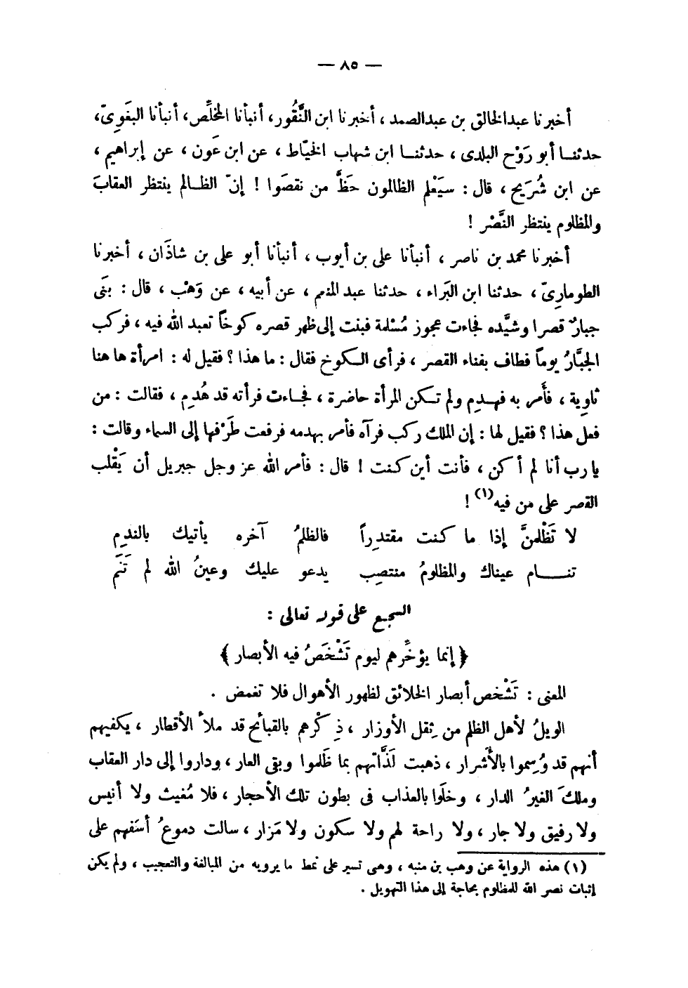 | | أخبرنا عبد الخالق بن عبد الصمد , أخبرنا ابن النقور , أنبأنا المخلص , أنبأنا البغوي , | حدثنا أبو روح البلدي , حدثنا ابن شهاب الخياط , عن ابن عون , عن إبراهيم , | عن ابن شريح , قال : سيعلم الظالمون حظ من نقصوا ! إن الظالم ينتظر العقاب | والمظلوم ينتظر النصر ! | | أخبرنا محمد بن ناصر , أنبأنا علي بن أيوب , أنبأنا أبو علي بن شاذان , أخبرنا | الطوماري , حدثنا ابن البراء , حدثنا عبد المنعم , عن أبيه , عن وهب , قال : بنى | جبار قصرا وشيده فجاءت عجوز مسلمة فبنت إلى ظهر قصره كوخا تعبد الله فيه , فركب | الجبار يوما فطاف بفناء القصر , فرأى الكوخ فقال : ما هذا ؟ فقيل له : امرأة ها هنا | ثاوية , فأمر به فهدم ولم تكن المرأة حاضرة , فجاءت فرأته قد هدم , فقالت : من | فعل هذا ؟ فقيل لها : إن الملك ركب فرآه فأمر بهدمه فرفعت طرفها إلى السماء وقالت : | يا رب أنا لم أكن , فأنت أين كنت ! قال : فأمر الله عز وجل جبريل أن يقلب | القصر على من فيه ! | | ( لا تظلمن إذا ما كنت مقتدراً % فالظلم آخره يأتيك بالندم ) % | | ( تنام عيناك والمظلوم منتصب % يدعو عليك وعين الله لم تنم ) % | السجع على قوله تعالى : ! 2 < إنما يؤخرهم ليوم تشخص فيه الأبصار > 2 ! | المعنى : تشخص أبصار الخلائق لظهور الأهوال فلا تغمض . | | الويل لأهل الظلم من ثقل الأوزار , ذكرهم بالقبائح قد ملأ الأقطار , يكفيهم | أنهم قد وسموا بالأشرار , ذهبت لذاتهم بما ظلموا وبقي العار , وداروا إلى دار العقاب | وملك الغير الدار , وخلوا بالعذاب في بطون تلك الأحجار , فلا مغيث ولا أنيس | ولا رفيق ولا جار , ولا راحة لهم ولا سكون ولا مزار , سالت دموع أسفهم على |