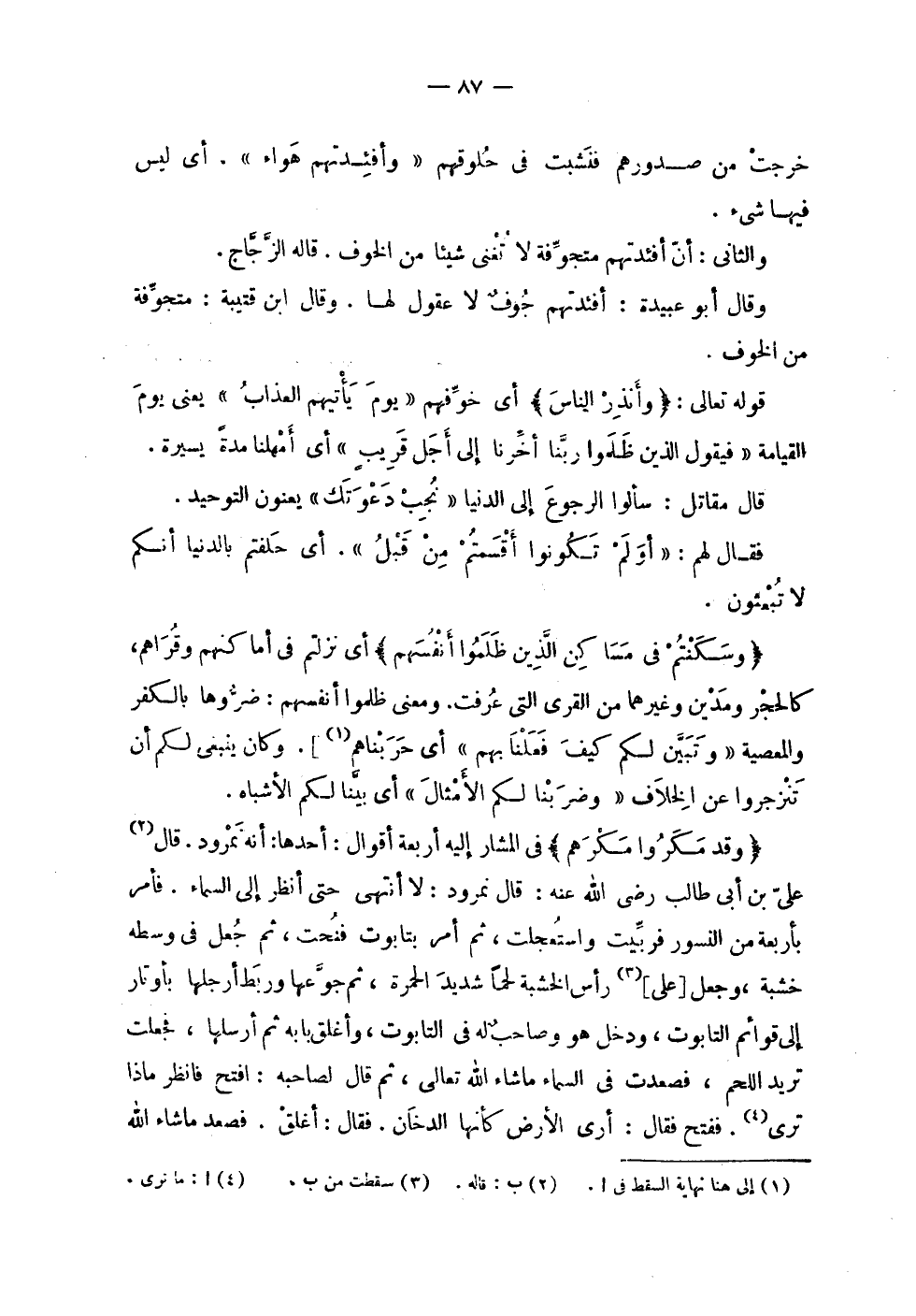 | خرجت من صدورهم فنشبت في حلوقهم ! 2 < وأفئدتهم هواء > 2 ! . أي ليس | فيها شيء . | | والثاني : أن أفئدتهم متجوفة لا تغني شيئاً من الخوف . قاله الزجاج . | | وقال أبو عبيدة : أفئدتهم جوف لا عقول لها . وقال ابن قتيبة : متجوفة | من الخوف . | | قوله تعالى : ! 2 < وأنذر الناس > 2 ! أي خوفهم ! 2 < يوم يأتيهم العذاب > 2 ! يعني يوم | القيامة ! 2 < فيقول الذين ظلموا ربنا أخرنا إلى أجل قريب > 2 ! أي أمهلنا مدة يسيرة . | | قال مقاتل : سألوا الرجوع إلى الدنيا ! 2 < نجب دعوتك > 2 ! يعنون التوحيد . | | فقال لهم : ! 2 < أولم تكونوا أقسمتم من قبل > 2 ! . أي حلفتم بالدنيا أنكم | لا تبعثون . | | ! 2 < وسكنتم في مساكن الذين ظلموا أنفسهم > 2 ! أي نزلتم في أماكنهم وقراهم , | كالحجر ومدين وغيرهما من القرى التي عرفت . ومعنى ظلموا أنفسهم : ضروها بالكفر | والمعصية ! 2 < وتبين لكم كيف فعلنا بهم > 2 ! أي حربناهم ] . وكان ينبغي لكم أن | تنزجروا عن الخلاف ! 2 < وضربنا لكم الأمثال > 2 ! أي بينا لكم الأشباه . | | ! 2 < وقد مكروا مكرهم > 2 ! في المشار إليه أربعة أقوال : أحدها : أنه نمرود . قال | علي بن أبي طالب رضي الله عنه : قال نمرود : لا أنتهي حتى أنظر إلى السماء . فأمر | بأربعة من النسور فربيت واستعجلت , ثم أمر بتابوت فنحت , ثم جعل في وسطه | خشبة , وجعل [ على ] رأس الخشبة لحماً شديد الحمرة , ثم جوعها وربط أرجلها بأوتار | إلى قوائم التابوت , ودخل هو وصاحب له في التابوت , وأغلق بابه ثم أرسلها , فجعلت | تريد اللحم , فصعدت في السماء ما شاء الله تعالى , ثم قال لصاحبه : افتح فانظر ماذا | ترى . ففتح فقال : أرى الأرض كأنها الدخان . فقال : أغلق . فصعد ما شاء الله |