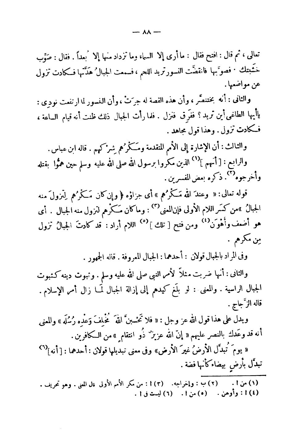 | تعالى , ثم قال : افتح فقال : ما أرى إلا السماء وما تزداد منها إلا بعداً . فقال : صوب | خشبتك . فصوبها فانقضت النسور تريد اللحم , فسمعت الجبال هدتها فكادت تزول | عن مواضعها . | | والثاني : أنه بختنصر , وأن هذه القصة له جرت , وأن النسور لما ارتفعت نودي : | يا أيها الطاغي أين تريد ؟ ففرق فنزل . فلما رأت الجبال ذلك ظنت أنه قيام الساعة , | فكادت تزول . وهذا قول مجاهد . | | والثالث : أن الإشارة إلى الأمم المتقدمة ومكرهم شركهم . قاله ابن عباس . | | والرابع : [ أنهم ] الذين مكروا برسول الله صلى الله عليه وسلم حين هموا بقتله | وأخرجوه . ذكره بعض المفسرين . | | قوله تعالى : ! 2 < وعند الله مكرهم > 2 ! أي جزاؤه ! 2 < وإن كان مكرهم لتزول منه الجبال > 2 ! من كسر اللام الأولى فإن المعنى : وما كان مكرهم لتزول منه الجبال . أي | هو أضعف وأهون ومن فتح [ تلك ] اللام أراد : قد كادت الجبال تزول | من مكرهم . | | وفي المراد بالجبال قولان : أحدهما : الجبال المعروفة . قاله الجمهور . | | والثاني : أنها ضربت مثلاً لأمر النبي صلى الله عليه وسلم . وثبوت دينه كثبوت | الجبال الراسية . والمعنى : لو بلغ كيدهم إلى إزالة الجبال لما زال أمر الإسلام . | قاله الزجاج . | | ويدل على هذا قول الله عز وجل : ! 2 < فلا تحسبن الله مخلف وعده رسله > 2 ! والمعنى | أنه قد وعدك بالنصر عليهم ! 2 < إن الله عزيز ذو انتقام > 2 ! من الكافرين . | | ! 2 < يوم تبدل الأرض غير الأرض > 2 ! وفي معنى تبديلها قولان : أحدهما : [ أنه ] | تبدل بأرض بيضاء كأنها فضة . |