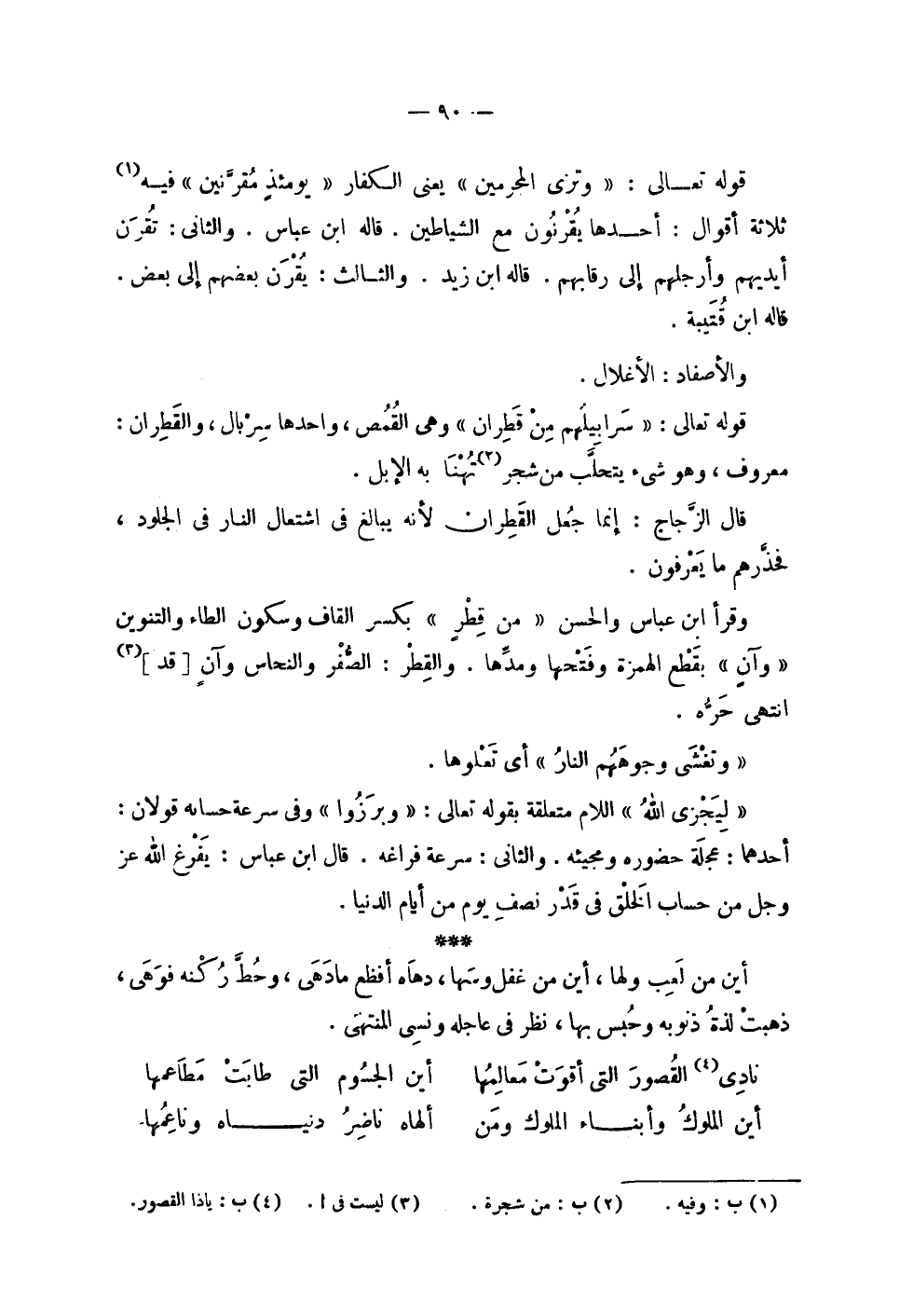 | | قوله تعالى : ! 2 < وترى المجرمين > 2 ! يعني الكفار ! 2 < يومئذ مقرنين > 2 ! فيه | ثلاثة أقوال : أحدها يقرنون مع الشياطين . قاله ابن عباس . والثاني : تقرن | أيديهم وأرجلهم إلى رقابهم . قاله ابن زيد . والثالث : يقرن بعضهم إلى بعض . | قاله ابن قتيبة . | | والأصفاد : الأغلال . | | قوله تعالى : ! 2 < سرابيلهم من قطران > 2 ! وهي القمص , واحدها سربال , والقطران : | معروف , وهو شيء يتحلب من شجر تهنا به الإبل . | | قال الزجاج : إنما جعل القطران لأنه يبالغ في اشتعال النار في الجلود , | فحذرهم ما يعرفون . | | وقرأ ابن عباس والحسن ! 2 < من قطر > 2 ! بكسر القاف وسكون الطاء والتنوين | ! 2 < وأن > 2 ! بقطع الهمزة وفتحها ومدها . والقطر : الصفر والنحاس وآن [ قد ] | انتهى حره . | | ! 2 < وتغشى وجوههم النار > 2 ! أي تعلوها . | | ! 2 < ليجزي الله > 2 ! اللام متعلقة بقوله تعالى : ! 2 < وبرزوا > 2 ! وفي سرعة حسابه قولان : | أحدهما : عجلة حضوره ومجيئه . والثاني : سرعة فراغه . قال ابن عباس : يفرغ الله عز | وجل من حساب الخلق في قدر نصف يوم من أيام الدنيا . | | أين من لعب ولها , أين من غفل وسها , دهاه أفظع ما دهى , وحط ركنه فوهى , | ذهبت لذة ذنوبه وحبس بها , نظر في عاجله ونسي المنتهى . | | ( نادى القصور التي أقوت معالمها % أين الجسوم التي طابت مطاعمها ) % | | ( أين الملوك وأبناء الملوك ومن % ألهاه ناضر دنياه وناعمها ) % |