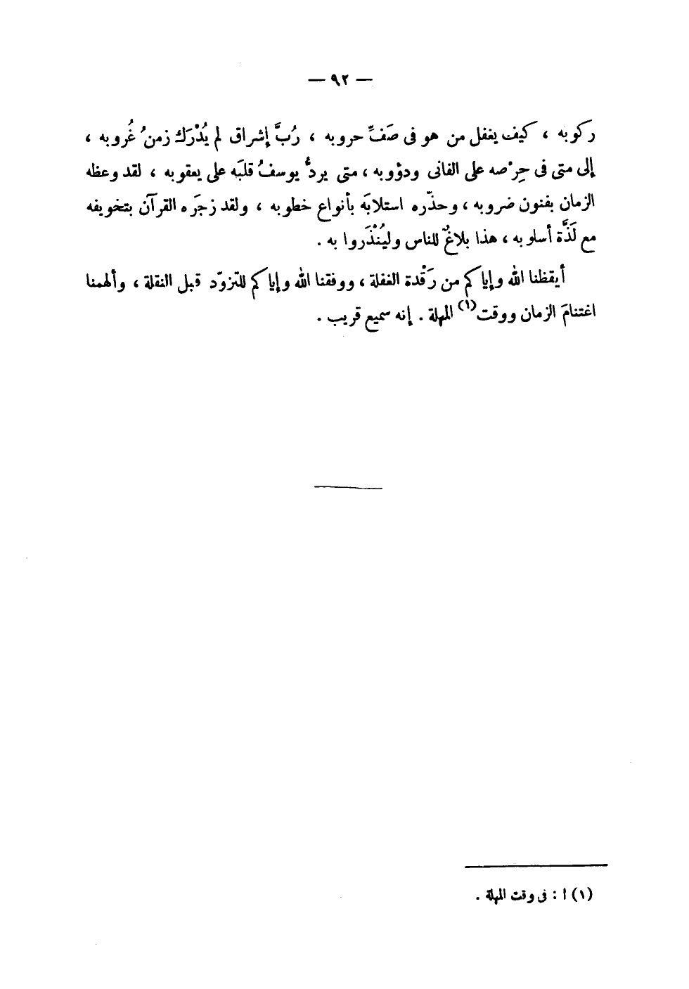| ركوبه , كيف يغفل من هو في صف حروبه , رب إشراق لم يدرك زمن غروبه ، | إلى متى في حرصه على الفاني ودؤوبه , متى يرد يوسف قلبه على يعقوبه , لقد وعظه | الزمان بفنون ضروبه , وحذره استلابه بأنواع خطوبه , ولقد زجره القرآن بتخويفه | مع لذة أسلوبه , هذا بلاغ للناس ولينذروا به . | | أيقظنا الله وإياكم من رقدة الغفلة , ووفقنا الله وإياكم للتزود قبل النقلة , وألهمنا | اغتنام الزمان ووقت المهلة . إنه سميع قريب . |