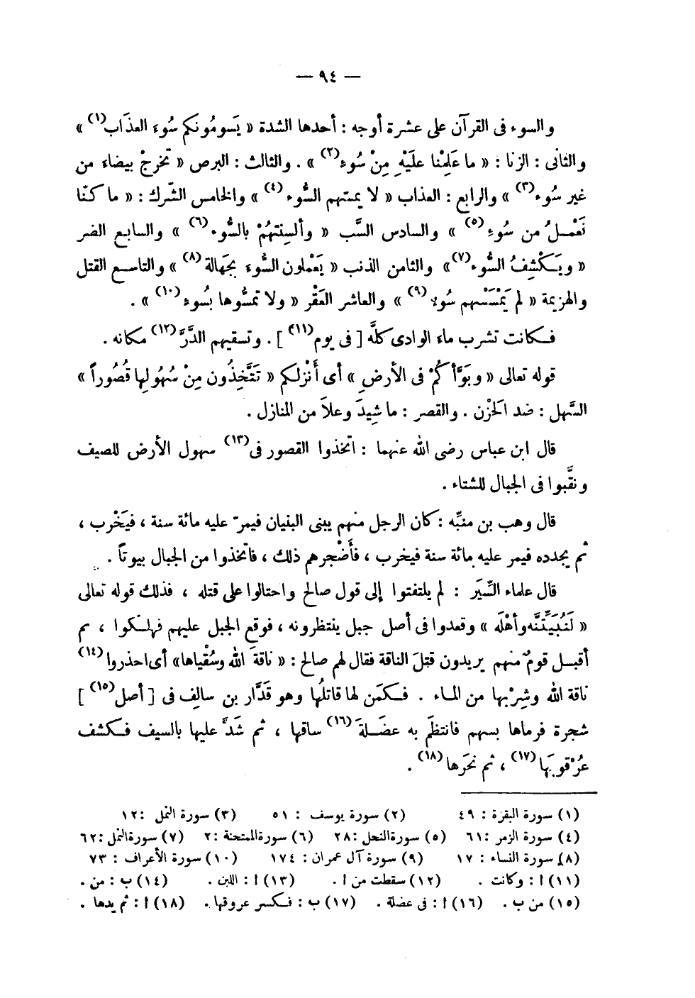 | | والسوء في القرآن على عشرة أوجه : أحدها الشدة ! 2 < يسومونكم سوء العذاب > 2 ! | والثاني : الزنا : ! 2 < ما علمنا عليه من سوء > 2 ! . والثالث : البرص ! 2 < تخرج بيضاء من غير سوء > 2 ! والرابع : العذاب ! 2 < لا يمسهم السوء > 2 ! والخامس الشرك : ! 2 < ما كنا نعمل من سوء > 2 ! والسادس السب : ! 2 < وألسنتهم بالسوء > 2 ! والسابع الضر : | ! 2 < ويكشف السوء > 2 ! والثامن الذنب : ! 2 < يعملون السوء بجهالة > 2 ! والتاسع القتل | والهزيمة : ^ ( لم يمسهم سوء ) ^ والعاشر العقر : ! 2 < ولا تمسوها بسوء > 2 ! . | | فكانت تشرب ماء الوادي كله [ في يوم ] . وتسقيهم الدر مكانه . | | قوله تعالى : ! 2 < وبوأكم في الأرض > 2 ! أي أنزلكم ! 2 < تتخذون من سهولها قصورا > 2 ! | السهل : ضد الحزن . والقصر : ما شيد وعلا من المنازل . | | قال ابن عباس رضي الله عنهما : اتخذوا القصور في سهول الأرض للصيف | ونقبوا في الجبال للشتاء . | | قال وهب بن منبه : كان الرجل منهم يبني البنيان فيمر عليه مائة سنة , فيخرب , | ثم يجدده فيمر عليه مائة سنة فيخرب , فأضجرهم ذلك , فاتخذوا من الجبال بيوتاً . | | قال علماء السير : لم يلتفتوا إلى قول صالح واحتالوا على قتله , فذلك قوله تعالى : | ! 2 < لنبيتنه وأهله > 2 ! وقعدوا في أصل جبل ينتظرونه , فوقع الجبل عليهم فهلكوا , ثم | أقبل قوم منهم يريدون قتل الناقة فقال لهم صالح : ! 2 < ناقة الله وسقياها > 2 ! أي احذروا | ناقة الله وشربها من الماء . فكمن لها قاتلها وهو قدار بن سالف في [ أصل ] | شجرة فرماها بسهم فانتظم به عضلة ساقها , ثم شد عليها بالسيف فكشف | عرقوبها , ثم نحرها . |