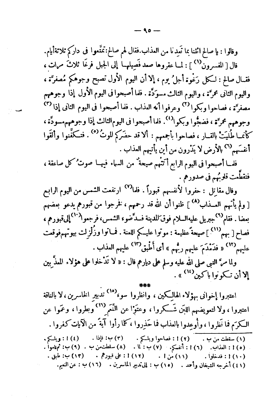| | وقالوا : يا صالح ائتنا بما تعدنا من العذاب . فقال لهم صالح : تمتعوا في داركم ثلاثة أيام . | | قال [ المفسرون ] : لما عقروها صعد فصيلها إلى الجبل فرغا ثلاث مرات , | فقال صالح : لكل رغوة أجل يوم , إلا أن اليوم الأول تصبح وجوهكم مصفرة , | واليوم الثاني محمرة , واليوم الثالث مسودة . فلما أصبحوا في اليوم الأول إذا وجوههم | مصفرة , فصاحوا وبكوا وعرفوا أنه العذاب . فلما أصبحوا في اليوم الثاني إذا | وجوههم محمرة , فضجوا وبكوا . فلما أصبحوا في اليوم الثالث إذا وجوههم مسودة , | كأنما طليت بالقار , فصاحوا بأجمعهم : ألا قد حضركم الموت . فتكفنوا وألقوا | أنفسهم بالأرض لا يدرون من أين يأتيهم العذاب . | | فلما أصبحوا في اليوم الرابع أتتهم صيحة من السماء فيها صوت كل صاعقة , | فتقطعت قلوبهم في صدورهم . | | وقال مقاتل : حفروا لأنفسهم قبوراً . فلما ارتفعت الشمس من اليوم الرابع | [ ولم يأتهم العذاب ] ظنوا أن الله قد رحمهم , فخرجوا من قبورهم يدعو بعضهم | بعضا . فقام جبريل عليه السلام فوق المدينة فسد ضوء الشمس , فرجعوا إلى قبورهم , | فصاح [ بهم ] صيحة عظيمة : موتوا عليكم اللعنة . فماتوا وزلزلت بيوتهم فوقعت | عليهم ! 2 < فدمدم عليهم ربهم > 2 ! أي أطبق عليهم العذاب . | | ولما مر النبي صلى الله عليه وسلم على ديارهم قال : ' لا تدخلوا على هؤلاء المعذبين | إلا أن تكونوا باكين ' . | | اعتبروا إخواني بهؤلاء الهالكين , وانظروا سوء تدبير الخاسرين , لا بالناقة | اعتبروا , ولا لتعويضهم اللبن شكروا , وعتوا عن النعم وبطروا , وعموا عن | الكرم فما نظروا , وأوعدوا بالعذاب فما حذروا , كلما رأوا آية من الآيات كفروا . |