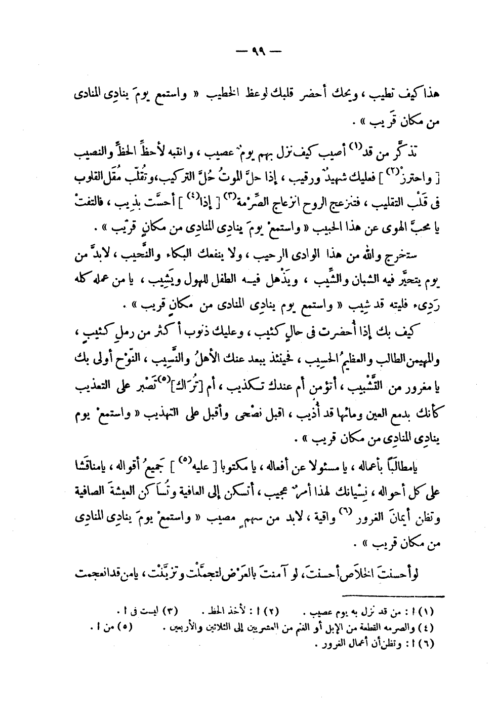 | هذا كيف تطيب , ويحك أحضر قلبك لوعظ الخطيب ^ ( واستمع يوم ينادي المنادي | من مكان قريب ) ^ . | | تذكر من قد أصيب كيف نزل بهم يوم عصيب , وانتبه لأحظ الحظ والنصيب | [ واحترز ] فعليك شهيد ورقيب , إذا حل الموت حل الترركيب , وتقلب مقل القلوب | في قلب التقليب , فتنزعج الروح انزعاج الصرمة [ إذا ] أحست بذيب , فالتفت | يا محب الهوى عن هذا الحبيب ^ ( واستمع يوم ينادي المنادي من مكان قريب ) ^ . | | ستخرج والله من هذا الوادي الرحيب , ولا ينفعك البكاء والنحيب , لا بد من | يوم يتحير فيه الشبان والشيب , ويذهل فيه الطفل للهول ويشيب , يا من عمله كله | رديء فليته قد شيب ^ ( واستمع يوم ينادي المنادي من مكان قريب ) ^ . | | كيف بك إذا أحضرت في حال كئيب وعليك ذنوب أكثر من رمل كثيب , | والمهيمن الطالب والعظيم الحسيب , فحينئذ يبعد عنك الأهل والنسيب , النوح أولى بك | يا مغرور من التشبيب , أتؤمن أم عندك تكذيب , أم [ تراك ] تصبر على التعذيب | كأنك بدمع العين ومائها قد أذيب , اقبل نصحي وأقبل على التهذيب ^ ( واستمع يوم | ينادي المنادي من مكان قريب ) ^ | | يا مطالباً بأعماله , يا مسئولاً عن أفعاله , يا مكتوباً [ عليه ] جميع أقواله , يا مناقشاً | على كل أحواله , نسيانك لهذا أمر عجيب , أتسكن إلى العافية وتساكن العيشة الصافية | وتظن أيمان الغرور واقية , لا بد من سهم مصيب ^ ( واستمع يوم ينادي المنادي | من مكان قريب ) ^ . | | لو أحسنت الخلاص أحسنت , لو آمنت بالعرض لتجملت وتزينت , يا من قد انعجمت | |