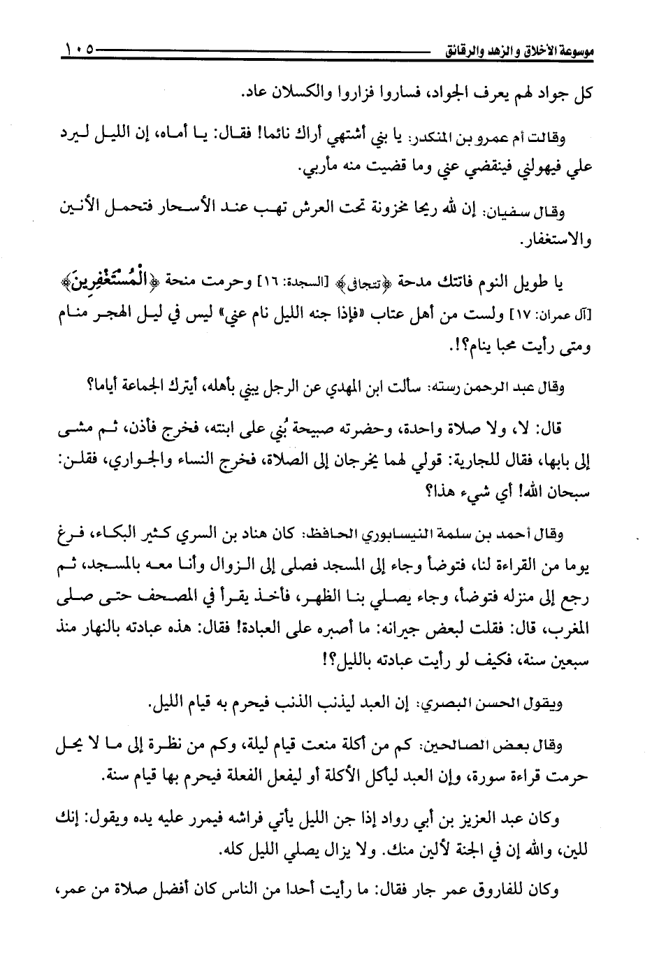 يا طويل النوم فاتتك مدحة {تَتَجَافَى} [السجدة: 16]، وحرمت منحة {الْمُسْتَغْفِرِينَ} [آل عمران: 17]، ولست من أهل عتاب" فإذا جنه الليل نام عني" ليس في ليل الهجر منام ومتى رأيت محبا ينام؟!.