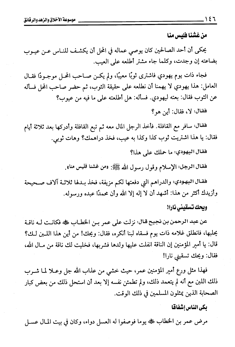 يحكى أن أحد الصالحين كان يوصي عماله في المحل أن يكشف للناس عن عيوب بضاعته إن وجدت، وكلما جاء مشتر أطلعه على العيب.