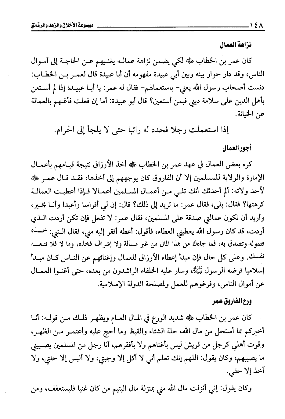 كان عمر بن الخطاب - رضي الله عنه - لكي يضمن نزاهة عماله يغنيهم عن الحاجة إلى أموال الناس، وقد دار حوار بينه وبين أبي عبيدة مفهومه أن أبا عبيدة قال لعمر بن الخطاب: دنست أصحاب رسول الله يعني -باستعمالهم- فقال له عمر: يا أبا عبيدة إذا لم أستعن بأهل الدين على سلامة ديني فبمن أستعين؟ قال أبو عبيدة: أما إن فعلت فأغنهم بالعمالة عن الخيانة.