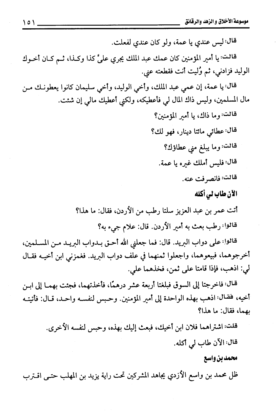 قال: يا عمة، إن عمي عبد الملك، وأخي الوليد، وأخي سليمان كانوا يعطونك من مال المسلمين، وليس ذاك المال لي فأعطيكه، ولكني أعطيك مالي إن شئت.