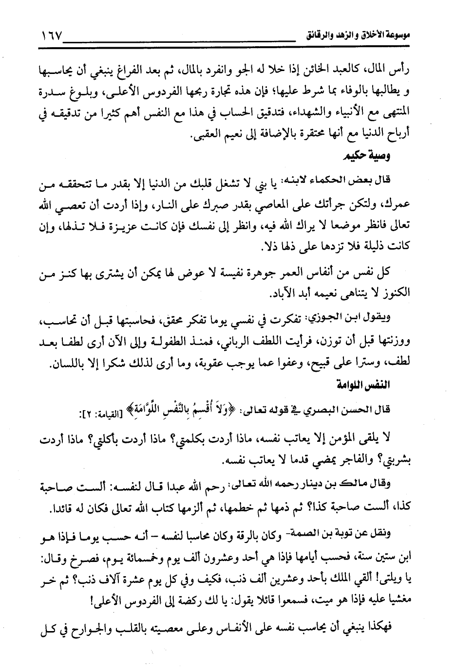 رأس المال، كالعبد الخائن إذا خلا له الجو وانفرد بالمال، ثم بعد الفراغ ينبغي أن يحاسبها ويطالبها بالوفاء بما شرط عليها؛ فإن هذه تجارة ربحها الفردوس الأعلى، وبلوغ سدرة المنتهى مع الأنبياء والشهداء، فتدقيق الحساب في هذا مع النفس أهم كثيرا من تدقيقه في أرباح الدنيا مع أنها محتقرة بالإضافة إلى نعيم العقبى.