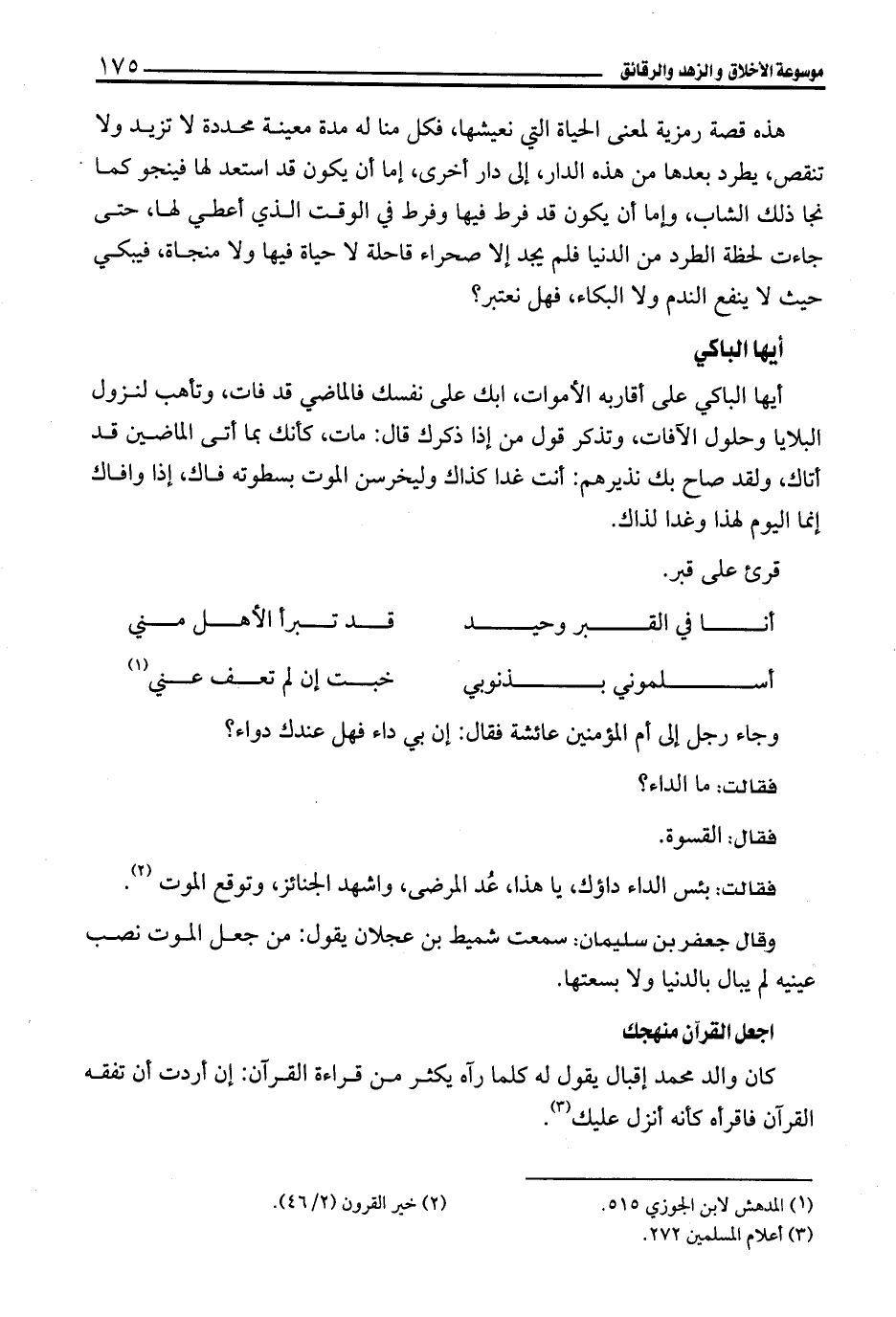 أيها الباكي على أقاربه الأموات، ابك على نفسك فالماضي قد فات، وتأهب لنزول البلايا وحلول الآفات، وتذكر قول من إذا ذكرك قال: مات، كأنك بما أتى الماضين قد أتاك، ولقد صاح بك نذيرهم: أنت غدا كذاك وليخرسن الموت بسطوته فاك، إذا وافاك إنما اليوم لهذا وغدا لذاك.