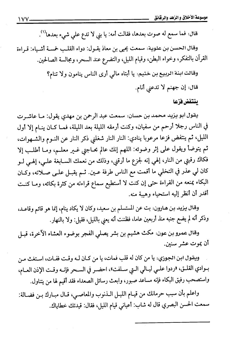- ويقول ابن الجوزي: يا من كان له قلب فمات، يا من كان له وقت ففات، استغث من بوادي القلق، "ردوا علي ليالي التي سلفت"، احضر في السحر فإنه وقت الإذن العام، واستصحب رفيق البكاء فإنه مساعد صبور، وابعث رسائل الصعداء فقد أقيم لها من يتناول.
