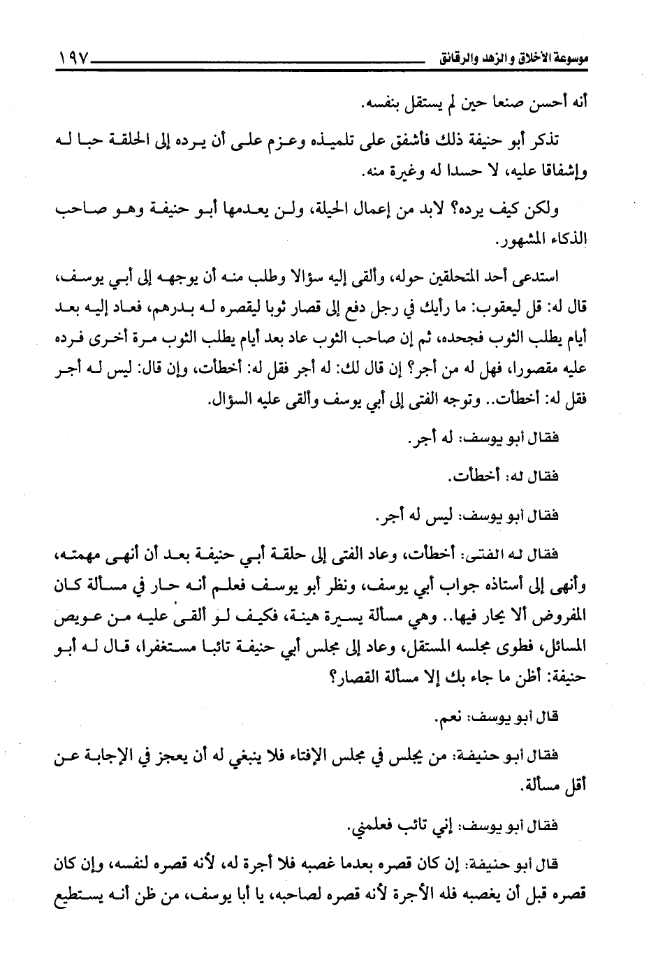 استدعى أحد المتحلقين حوله، وألقى إليه سؤالا وطلب منه أن يوجهه إلى أبي يوسف، قال له: قل ليعقوب: ما رأيك في رجل دفع إلى قصار ثوبا ليقصره له بدرهم، فعاد إليه بعد أيام يطلب الثوب فجحده، ثم إن صاحب الثوب عاد بعد أيام يطلب الثوب مرة أخرى فرده عليه مقصورا، فهل له من أجر؟ إن قال لك: له أجر فقل له: أخطأت، وإن قال: ليس له أجر فقل له: أخطأت .. وتوجه الفتى إلى أبي يوسف وألقى عليه السؤال.