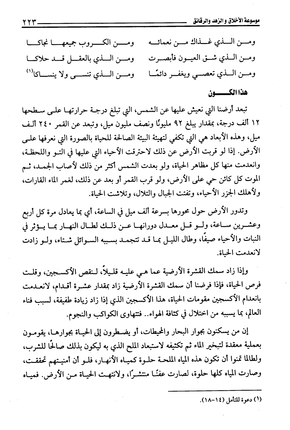 تبعد أرضنا التي نعيش عليها عن الشمس، التي تبلغ درجة حرارتها على سطحها 12 ألف درجة، بمقدار يبلغ 92 مليونا ونصف مليون ميل، وتبعد عن القمر 240 ألف ميل، وهذه الأبعاد هي التي تكفي لتهيئة البيئة الصالحة للحياة بالصورة التي نعرفها على الأرض. إذا لو قربت الأرض عن ذلك لاحترقت الأحياء التي عليها في التو واللحظة، وانعدمت منها كل مظاهر الحياة، ولو بعدت الشمس أكثر من ذلك لأصاب الجمد، ثم الموت كل كائن حي على الأرض، ولو قرب القمر أو بعد عن ذلك، لغمر الماء القارات، ولأهلك الجزر الأحياء، وتفتت الجبال والتلال، وتلاشت الحياة.