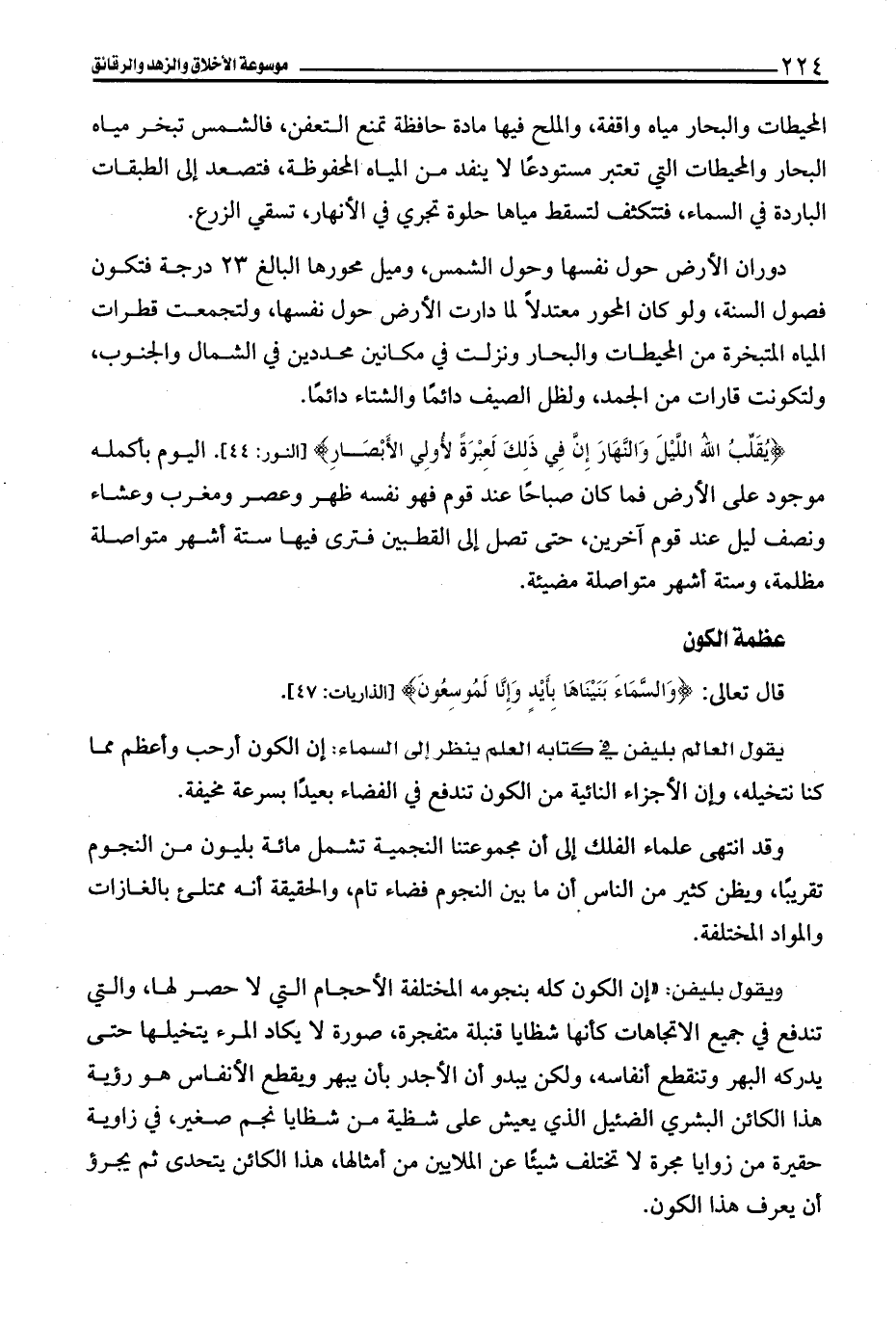 {يُقَلِّبُ اللَّهُ اللَّيْلَ وَالنَّهَارَ إِنَّ فِي ذَلِكَ لَعِبْرَةً لِأُولِي الْأَبْصَارِ} [النور: 44]. اليوم بأكمله موجود على الأرض فما كان صباحًا عند قوم فهو نفسه ظهر وعصر ومغرب وعشاء ونصف ليل عند قوم آخرين، حتى تصل إلى القطبين فترى فيها ستة أشهر متواصلة مظلمة، وستة أشهر متواصلة مضيئة.