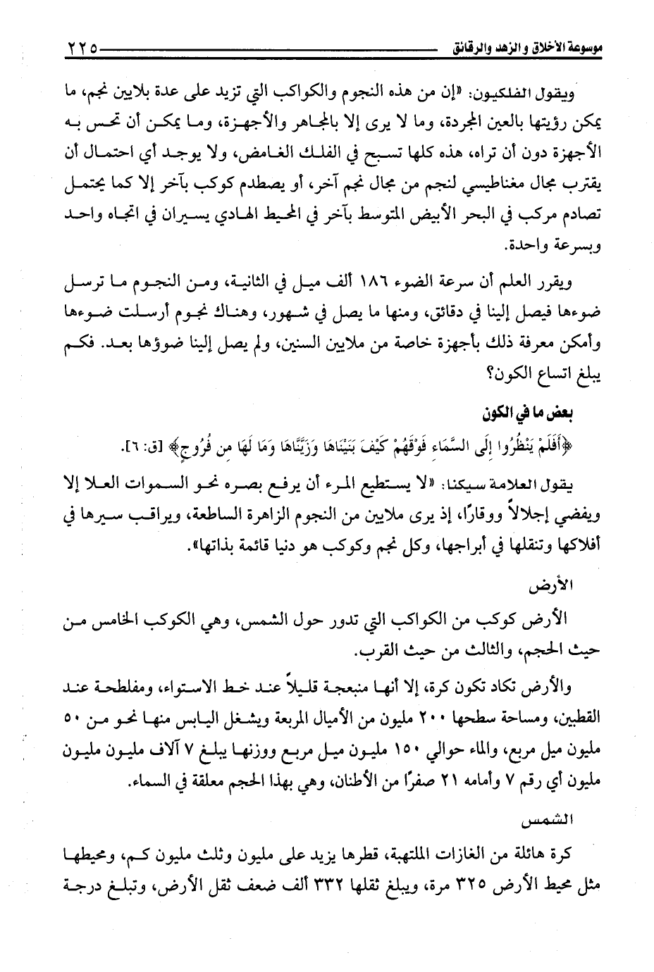 ويقرر العلم أن سرعة الضوء 186 ألف ميل في الثانية، ومن النجوم ما ترسل ضوءها فيصل إلينا في دقائق، ومنها ما يصل في شهور، وهناك نجوم أرسلت ضوءها وأمكن معرفة ذلك بأجهزة خاصة من ملايين السنين، ولم يصل إلينا ضوؤها بعد. فكم يبلغ اتساع الكون؟