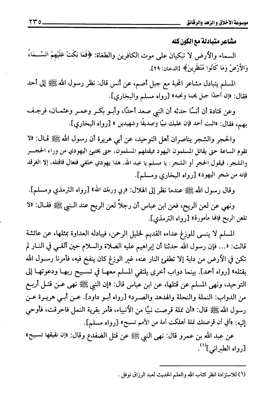 المسلم يتبادل مشاعر المحبة مع جبل أصم، عن أنس قال: نظر رسول الله - صلى الله عليه وسلم - إلى أحد فقال: "إن أحدًا جبل يحبنا ونحبه" [رواه مسلم والبخاري].