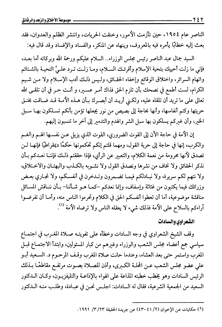 السيد جمال عبد الناصر رئيس مجلس الوزراء .. السلام عليكم ورحمة الله وبركاته أما بعد، فإني ما زلت أحييك بتحية الإسلام وأقرئك السلام، وما زلت ترد عليَّ التحية بالشتائم واتهام السرائر، واختلاق الوقائع وإخفاء الحقائق، وليس ذلك أدب الإسلام ولا من شيم الكرام، لست أطمع في نصحك بأن تلزم الحق فذاك أمر عسير، وأنت حر في أن تلقى الله تعالى على ما تريد أن تلقاه عليه، ولكني أريد أن أبصرك بأن هذه الأمة قد ضاقت بخنق حريتها وكتم أنفاسها، وأنها بحاجة إلى بصيص من نور يجعلها تؤمن بأنكم تسلكون بها سبل الخير، وأن غيركم يسلكون بها سبل الشر والهدم والتدمير إلى آخر ما تنسبون إليهم.