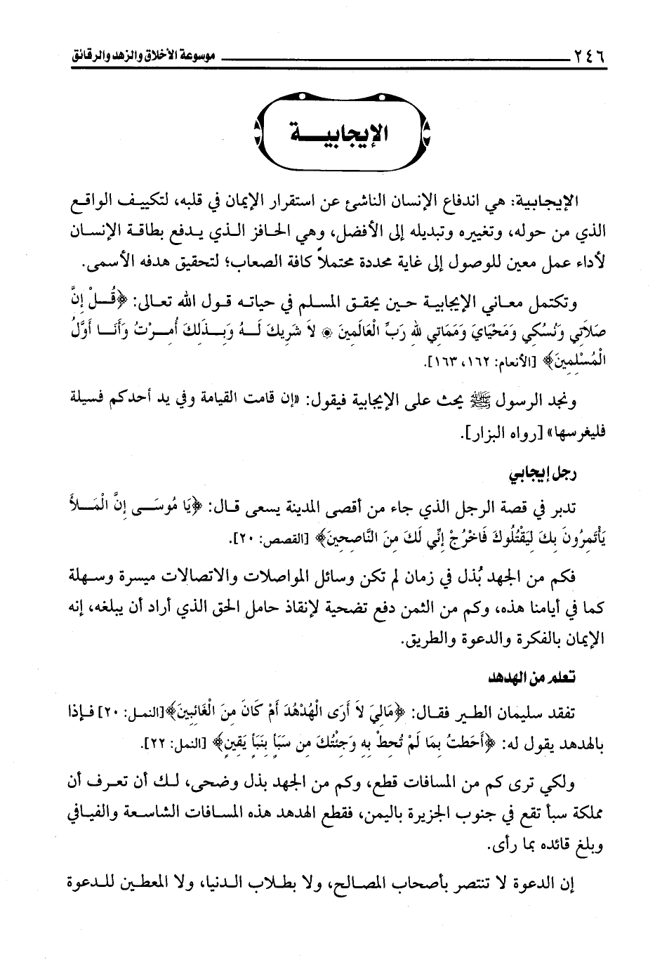 ونجد الرسول - صلى الله عليه وسلم - يحث على الإيجابية فيقول:" إن قامت القيامة وفي يد أحدكم فسيلة فليغرسها" [رواه البزار].