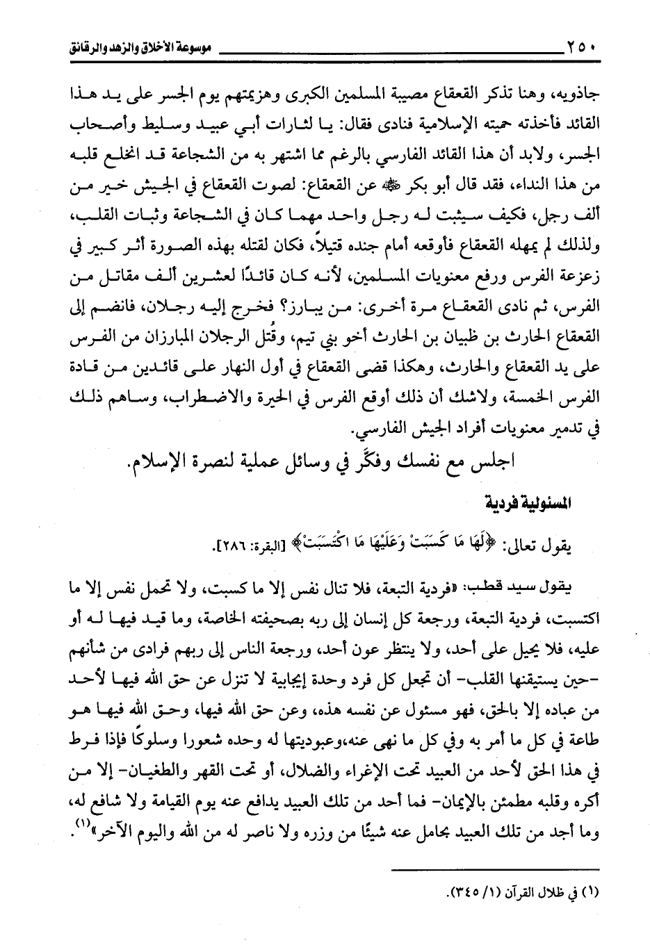 يقول سيد قطب:"فردية التبعة، فلا تنال نفس إلا ما كسبت، ولا تحمل نفس إلا ما اكتسبت، فردية التبعة، ورجعة كل إنسان إلى ربه بصحيفته الخاصة، وما قيد فيها له أو عليه، فلا يحيل على أحد، ولا ينتظر عون أحد، ورجعة الناس إلى ربهم فرادى من شأنهم -حين يستيقنها القلب- أن تجعل كل فرد وحدة إيجابية لا تنزل عن حق الله فيها لأحد من عباده إلا بالحق، فهو مسئول عن نفسه هذه، وعن حق الله فيها، وحق الله فيها هو طاعة في كل ما أمر به وفي كل ما نهى عنه، وعبوديتها له وحده شعورا وسلوكًا فإذا فرط في هذا الحق لأحد من العبيد تحت الإغراء والضلال، أو تحت القهر والطغيان -إلا من أكره وقلبه مطمئن بالإيمان- فما أحد من تلك العبيد يدافع عنه يوم القيامة ولا شافع له، وما أجد من تلك العبيد بحامل عنه شيئًا من وزره ولا ناصر له من الله واليوم الآخر" (¬1).