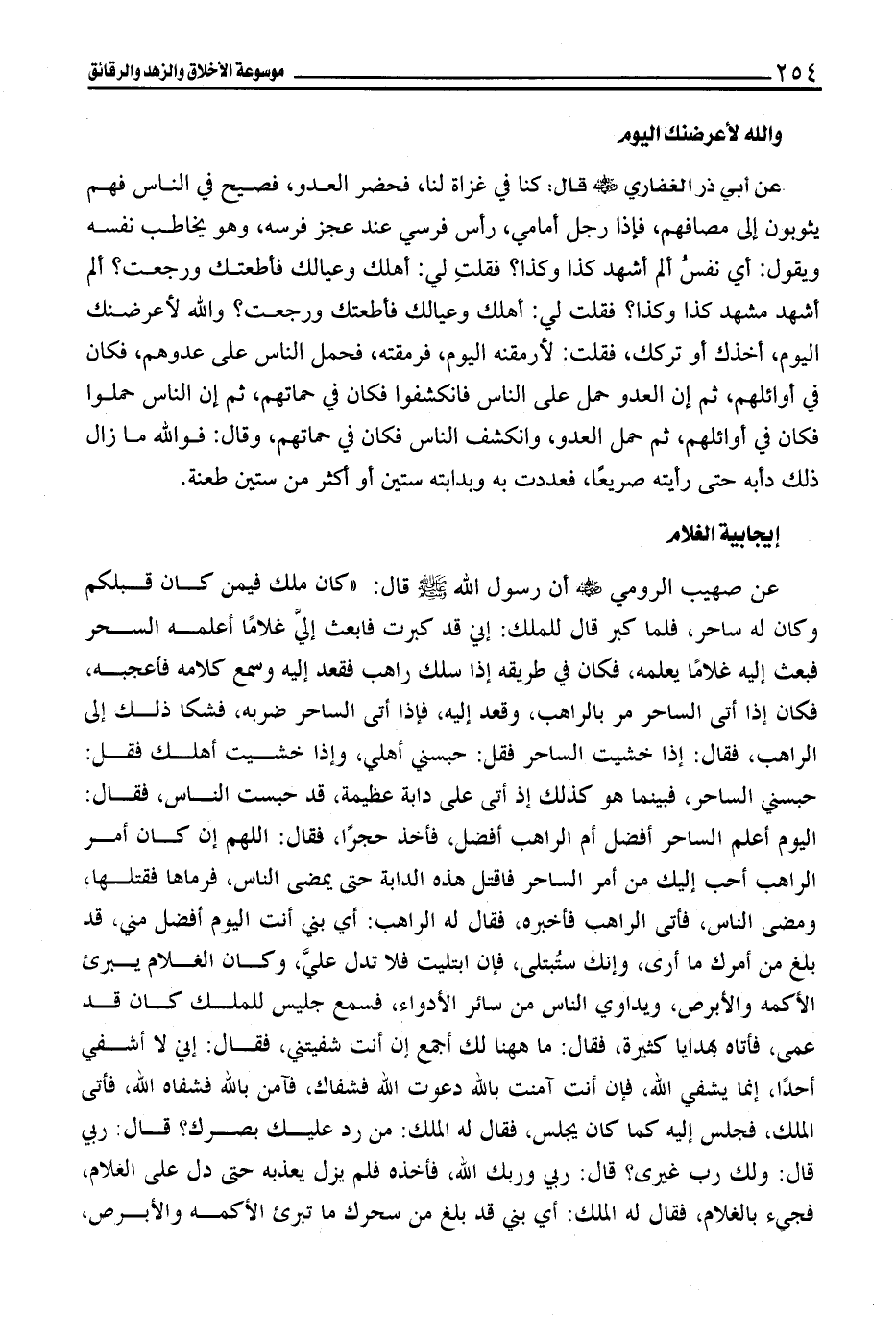 عن صهيب الرومي - رضي الله عنه - أن رسول الله - صلى الله عليه وسلم - قال: "كان ملك فيمن كان قبلكم وكان له ساحر، فلما كبر قال للملك: إني قد كبرت فابعث إليَّ غلامًا أعلمه السحر فبعث إليه غلامًا يعلمه، فكان في طريقه إذا سلك راهب فقعد إليه وسمع كلامه فأعجبه، فكان إذا أتى الساحر مر بالراهب، وقعد إليه، فإذا أتى الساحر ضربه، فشكا ذلك إلى الراهب، فقال: إذا خشيت الساحر فقل: حبسني أهلي، وإذا خشيت أهلك فقل: حبسني الساحر، فبينما هو كذلك إذ أتى على دابة عظيمة، قد حبست الناس، فقال: اليوم أعلم الساحر أفضل أم الراهب أفضل، فأخذ حجرًا، فقال: اللهم إن كان أمر الراهب أحب إليك من أمر الساحر فأقتل هذه الدابة حتى يمضي الناس، فرماها فقتلها، ومضى الناس، فأتى الراهب فأخبره، فقال له الراهب: أي بني أنت اليوم أفضل مني، قد بلغ من أمرك ما أرى، وإنك ستُبتلى، فإن ابتليت فلا تدل عليَّ، وكان الغلام يبريء الأكمه والأبرص، ويداوي الناس من سائر الأدواء، فسمع جليس للملك كان قد عمى، فأتاه بهدايا كثيرة، فقال: ما ههنا لك أجمع إن أنت شفيتني، فقال: إني لا أشفي أحدًا، إنما يشفي الله، فإن أنت آمنت بالله دعوت الله فشفاك، فآمن بالله فشفاه الله، فأتى الملك، فجلس إليه كما كان يجلس، فقال له الملك: من رد عليك بصرك؟ قال ربي قال: ولك رب غيرى؟ قال: رب وربك الله، فأخذه فلم يزل يعذبه حتى دل على الغلام، فجىء بالغلام، فقال له الملك: أي بني قد بلغ من سحرك ما تبرئ الأكمه والأبرص،