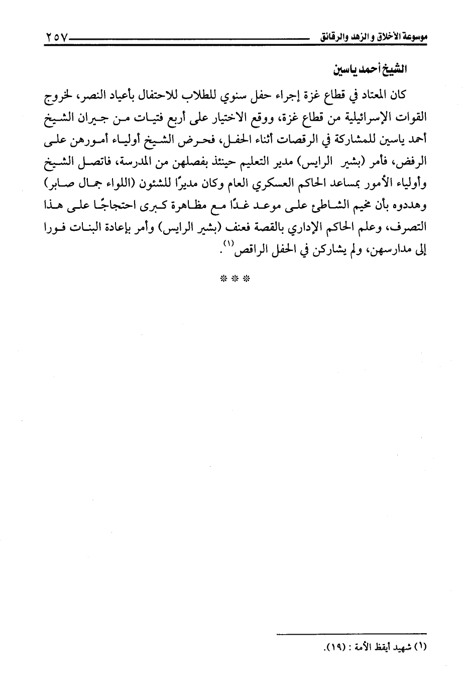 كان المعتاد في قطاع غزة إجراء حفل سنوي للطلاب للاحتفال بأعياد النصر، لخروج القوات الإسرائيلية من قطاع غزة، ووقع الاختيار على أربع فتيات من جيران الشيخ أحمد ياسين للمشاركة في الرقصات أثناء الحفل، فحرض الشيخ أولياء أمورهن على الرفض، فأمر (بشير الرايس) مدير التعليم حينئذ بفصلهن من المدرسة، فاتصل الشيخ وأولياء الأمور بمساعد الحاكم العسكري العام وكان مديرًا للشئون (اللواء جمال صابر) وهددوه بأن مخيم الشاطيء على موعد غدًا مع مظاهرة كبرى احتجاجًا على هذا التصرف، وعلم الحاكم الإداري بالقصة فعنف (بشير الرايس) وأمر بإعادة البنات فورا إلى مدارسهن، ولم يشاركن في الحفل الراقص (¬1).