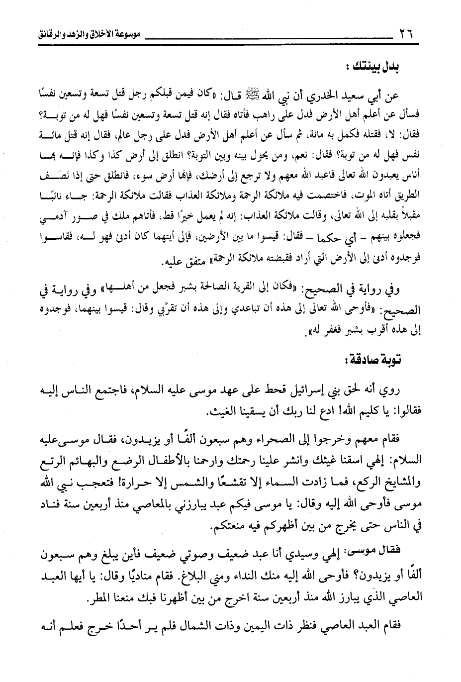 عن أبي سعيد الخدري أن نبي الله - صلى الله عليه وسلم - قال: "كان فيمن قبلكم رجل قتل تسعة وتسعين نفسًا فسأل عن أعلم أهل الأرض فدل على راهب فأتاه فقال إنه قتل تسعة وتسعين نفسًا فهل له من توبة؟ فقال: لا، فقتله فكمل به مائة، ثم سأل عن أعلم أهل الأرض فدل على رجل عالم، فقال إنه قتل مائة نفس فهل له من توبة؟ فقال: نعم، ومن يحول بينه وبين التوبة؟ انطلق إلى أرض كذا وكذا فإنه بها أناس يعبدون الله تعالى فاعبد الله معهم ولا ترجع إلى أرضك، فإنها أرض سوء، فانطلق حتى إذا نَصَف الطريق أتاه الموت، فاختصمت فيه ملائكة الرحمة وملائكة العذاب فقالت ملائكة الرحمة: جاء تائبًا مقبلاً بقلبه إلى الله تعالى، وقالت ملائكة العذاب: إنه لم يعمل خيرًا قط، فأتاهم ملك في صور آدمي فجعلوه بينهم -أي حكما- فقال: قيسوا ما بين الأرضين، فإلى أيتهما كان أدنى فهو له، فقاسوا فوجودوه أدنى إلى الأرض التي أراد فقبضته ملائكة الرحمة" متفق عليه.