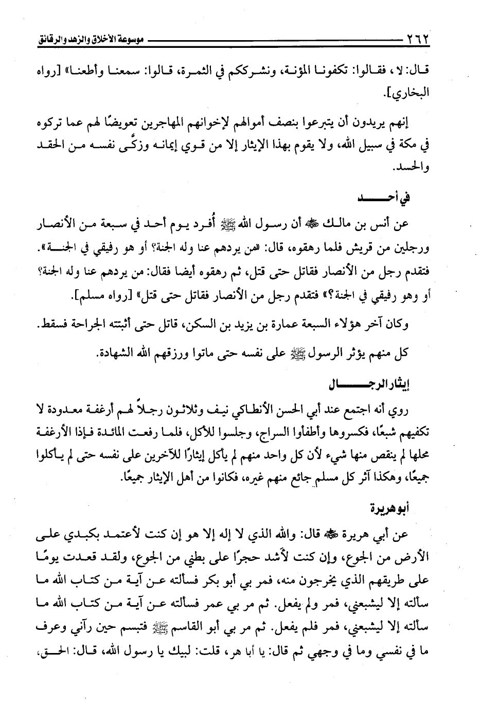 عن أنس بن مالك - رضي الله عنه - أن رسول - صلى الله عليه وسلم - أُفرد يوم أحد في سبعة من الأنصار ورجلين من قريش فلما رهقوه، قال:"من يردهم عنا وله الجنة؟ أو هو رفيقي في الجنة". فتقدم رجل من الأنصار فقاتل حتى قتل، ثم رهقوه أيضًا فقال: من يردهم عنا وله الجنة؟ أو وهو رفيقى في الجنة؟ " فتقدم رجل من الأنصار فقاتل حتى قتل" [رواه مسلم].