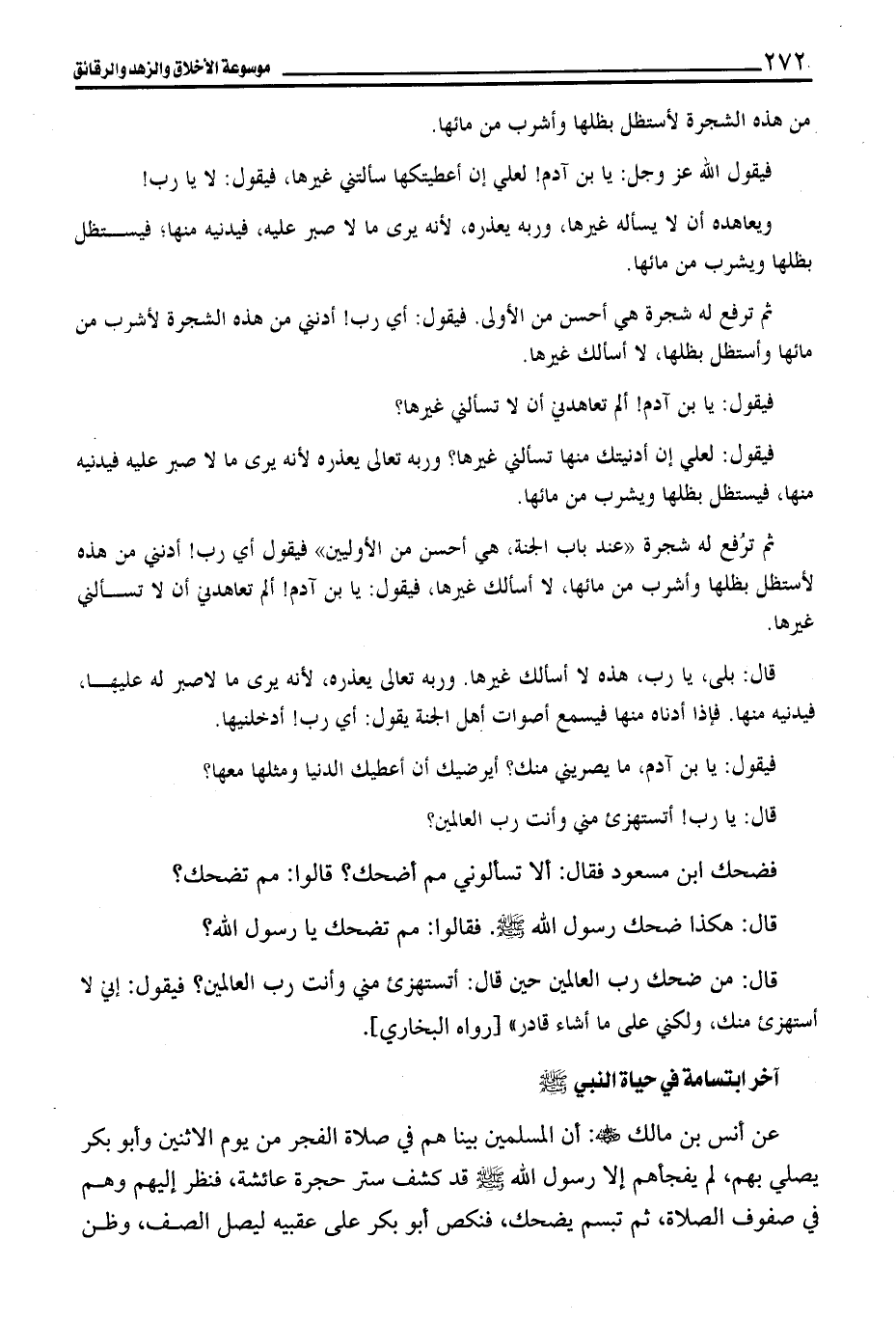 ثم ترفع له شجرة هي أحسن من الأولى. فيقول: أي رب! أدنني من هذه الشجرة لأشرب من مائها وأستظل بظلها، لا أسألك غيرها.