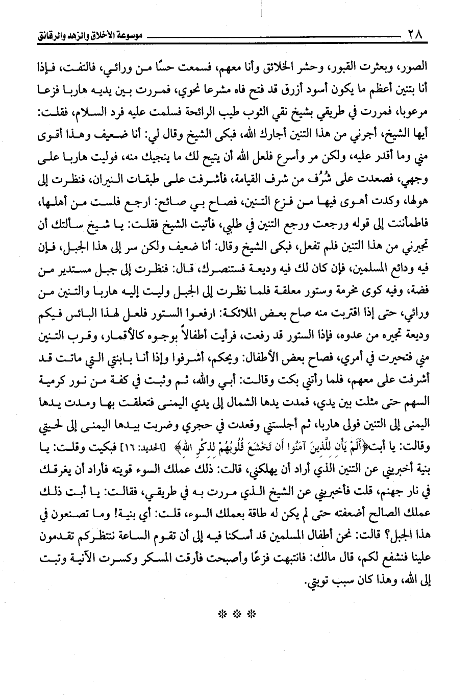 الصور، وبعثرت القبور، وحشر الخلائق وأنا معهم، فسمعت حسًّا من ورائي، فالتفت، فإذا أنا بتنين أعظم ما يكون أسود أزرق قد فتح فاه مشرعا نحوي، فمررت بين يديه هاربا فزعا مرعوبا، فمررت في طريقي بشيخ نقي الثوب طيب الرائحة فسلمت عليه فرد السلام، فقلت: أيها الشيخ، أجرني من هذا التنين أجارك الله، فبكى الشيخ وقال لي: أنا ضعيف وهذا أقوى مني وما أقدر عليه، ولكن مر وأسرع فلعل الله أن يتيح لك ما ينجيك منه، فوليت هاربا على وجهي، فصعدت على شُرُف من شرف القيامة، فأشرفت على طبقات النيران، فنظرت إلى هولها، وكدت أهوى فيها من فزع التنين، فصاح بي صائح: ارجع فلست من أهلها، فاطمأننت إلى قوله ورجعت ورجع التنين في طلبي، فأتيت الشيخ فقلت: يا شيخ سألتك أن تجيرني من هذا التنين فلم تفعل، فبكى الشيخ وقال: أنا ضعيف ولكن سر إلى هذا الجبل، فإن فيه ودائع المسلمين، فإن كان لك فيه وديعة فستنصرك، قال: فنظرت إلى جبل مستدير من فضة، وفيه كوى مخرمة وستور معلقة فلما نظرت إلى الجبل وليت إليه هاربا والتنين من ورائي، حتى إذا اقتربت منه صاح بعض الملائكة: ارفعوا الستور فلعل لهذا البائس فيكم وديعة تجيره من عدوه، فإذا الستور قد رفعت، فرأيت أطفالاً بوجوه كالأقمار، وقرب التنين مني فتحيرت في أمري، فصاح بعض الأطفال: ويحكم، أشرفوا وإذا أنا بابنتي التي ماتت قد أشرفت على معهم، فلما رأتني بكت وقالت: أبي والله، ثم وثبت في كفة من نور كرمية السهم حتى مثلت بين يدي، فمدت يدها الشمال إلى يدي اليمنى فتعلقت بها ومدت يدها اليمنى إلى التنين فولى هاربا، ثم أجلستني وقعدت في حجري وضربت بيدها اليمنى إلى لحتي وقالت: يا أبت {أَلَمْ يَأْنِ لِلَّذِينَ آمَنُوا أَنْ تَخْشَعَ قُلُوبُهُمْ لِذِكْرِ اللَّهِ} [الحديد: 16]، فبكيت وقلت: يا بنية أخبريني عن التنين الذي أراد أن يهلكني، قالت: ذلك عملك السوء قويته فأراد أن يغرقك في نار جهنم، قلت فأخبريني عن الشيخ الذي مررت به في طريقي، فقالت: يا أبت ذلك عملك الصالح أضعفته حتى لم يكن له طاقة بعملك السوء، قلت: أي بنية! وما تصنعون في هذا الجبل؟ قالت: نحن أطفال المسلمين قد أسكنا فيه إلى أن تقوم الساعة ننتظركم تقدمون علينا فنشفع لكم، قال مالك: فانتبهت فزعًا وأصبحت فأرقت المسكر وكسرت الأنية وتبت إلى الله، وهذا كان سبب توبتي.