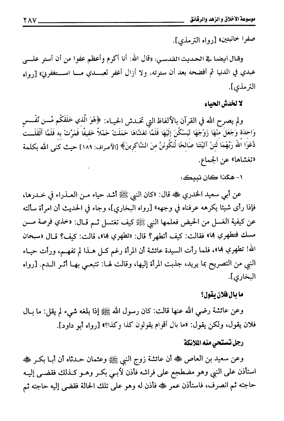 عن أبي سعيد الخدري - رضي الله عنه - قال: "كان النبي - صلى الله عليه وسلم - أشد حياء من العذراء في خدرها، فإذا رأى شيئا يكرهه عرفناه في وجهه" [رواه البخاري]، وجاء في الحديث أن امرأة سألته عن كيفية الغسل من الحيض فعلمها النبي - صلى الله عليه وسلم - كيف تغتسل ثم قال: "خذي فرصة من مسك فتطهري بها" فقالت: كيف أتطهر؟ قال: "تطهري بها"، قالت: كيف؟ قال "سبحان الله! تطهري بها"، فلما رأت السيدة عائشة أن المرأة رغم كل هذا لم تفهم، ورأت حياء النبي من التصريح بما يريد، جذبت المرأة إليها، وقالت لها: تتبعي بها أثر الدم. [رواه البخاري].