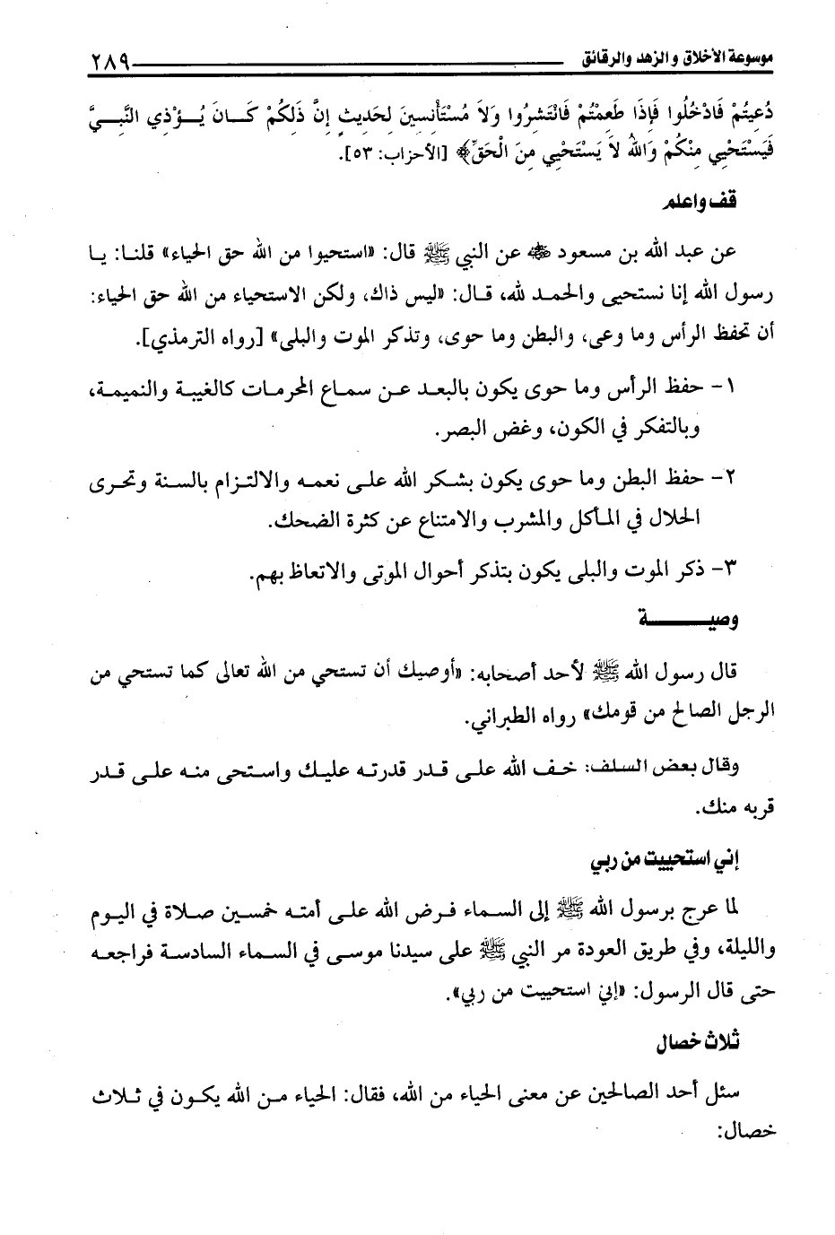 عن عبد الله بن مسعود - رضي الله عنه - عن النبي - صلى الله عليه وسلم - قال: "استحيوا من الله حق الحياء" قلنا: يا رسول الله إنا نستحيى والحمد لله، قال: "ليس ذاك، ولكن الاستحياء من الله حق الحياء: أن تحفظ الرأس وما وعى، والبطن وما حوى، وتذكر الموت والبلى" [رواه الترمذي].