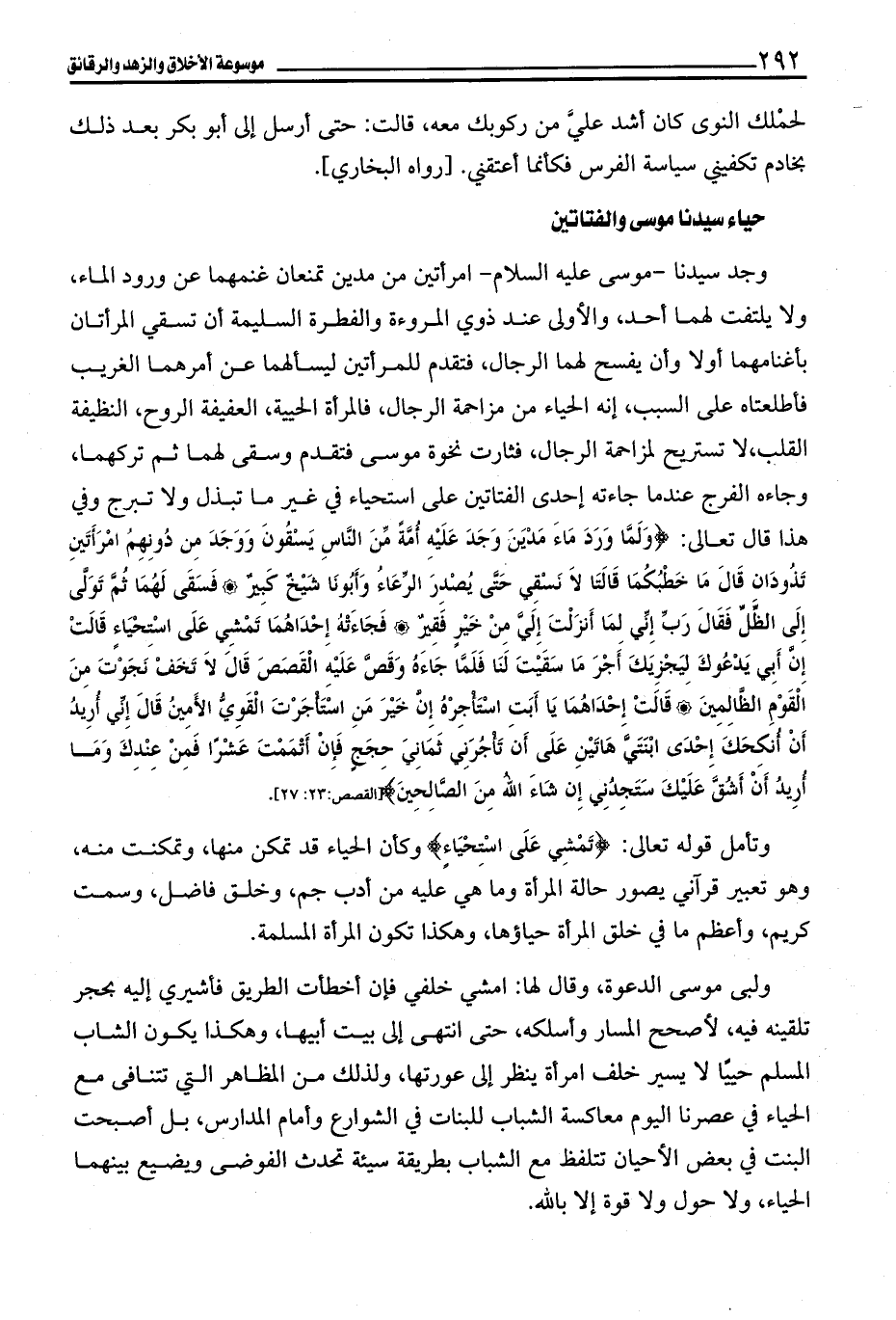 وجد سيدنا -موسى عليه السلام- امرأتين من مدين تمنعان غنمهما عن ورود الماء، ولا يلتفت لهما أحد، والأولى عند ذوي المروءة والفطرة السليمة أن تسقي المرأتان بأغنامهما أولا وأن يفسح لهما الرجال، فتقدم للمرأتين ليسألهما عن أمرهما الغريب فأطلعتاه على السبب، إنه الحياء من مزاحمة الرجال، فالمرأة الحيية، العفيفة الروح، النظيفة القلب، لا تستريح لمزاحمة الرجال، فثارت نخوة موسى فتقدم وسقى لهما ثم تركهما، وجاءه الفرج عندما جاءته إحدى الفتاتين على استحياء في غير ما تبذل ولا تبرج وفي هذا قال تعالى: {وَلَمَّا وَرَدَ مَاءَ مَدْيَنَ وَجَدَ عَلَيْهِ أُمَّةً مِنَ النَّاسِ يَسْقُونَ وَوَجَدَ مِنْ دُونِهِمُ امْرَأَتَيْنِ تَذُودَانِ قَالَ مَا خَطْبُكُمَا قَالَتَا لَا نَسْقِي حَتَّى يُصْدِرَ الرِّعَاءُ وَأَبُونَا شَيْخٌ كَبِيرٌ (23) فَسَقَى لَهُمَا ثُمَّ تَوَلَّى إِلَى الظِّلِّ فَقَالَ رَبِّ إِنِّي لِمَا أَنْزَلْتَ إِلَيَّ مِنْ خَيْرٍ فَقِيرٌ (24) فَجَاءَتْهُ إِحْدَاهُمَا تَمْشِي عَلَى اسْتِحْيَاءٍ قَالَتْ إِنَّ أَبِي يَدْعُوكَ لِيَجْزِيَكَ أَجْرَ مَا سَقَيْتَ لَنَا فَلَمَّا جَاءَهُ وَقَصَّ عَلَيْهِ الْقَصَصَ قَالَ لَا تَخَفْ نَجَوْتَ مِنَ الْقَوْمِ الظَّالِمِينَ (25) قَالَتْ إِحْدَاهُمَا يَا أَبَتِ اسْتَأْجِرْهُ إِنَّ خَيْرَ مَنِ اسْتَأْجَرْتَ الْقَوِيُّ الْأَمِينُ (26) قَالَ إِنِّي أُرِيدُ أَنْ أُنْكِحَكَ إِحْدَى ابْنَتَيَّ هَاتَيْنِ عَلَى أَنْ تَأْجُرَنِي ثَمَانِيَ حِجَجٍ فَإِنْ أَتْمَمْتَ عَشْرًا فَمِنْ عِنْدِكَ وَمَا أُرِيدُ أَنْ أَشُقَّ عَلَيْكَ سَتَجِدُنِي إِنْ شَاءَ اللَّهُ مِنَ الصَّالِحِينَ (27)} [القصص: 23 - 27].