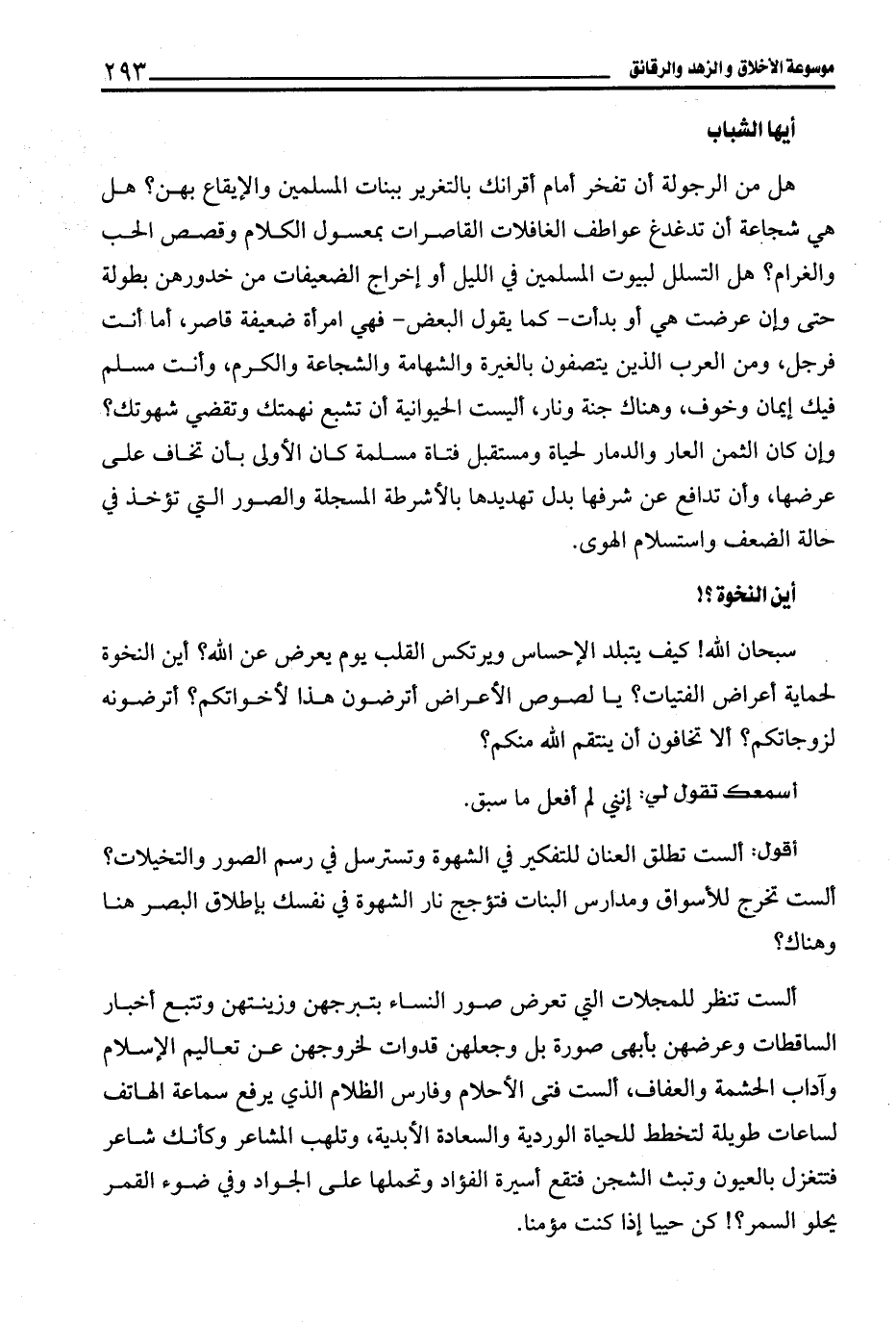 ألست تنظر للمجلات التي تعرض صور النساء بتبرجهن وزينتهن وتتبع أخبار الساقطات وعرضهن بأبهى صورة بل وجعلهن قدوات لخروجهن عن تعاليم الإسلام وآداب الحشمة والعفاف، ألست فتى الأحلام وفارس الظلام الذي يرفع سماعة الهاتف لساعات طويلة لتخطط للحياة الوردية والسعادة الأبدية، وتلهب المشاعر وكأنك شاعر فتتغزل بالعيون وتبث الشجن فتقع أسيرة الفؤاد وتحملها على الجواد وفي ضوء القمر يحلو السمر؟! كن حييا إذا كنت مؤمنا.