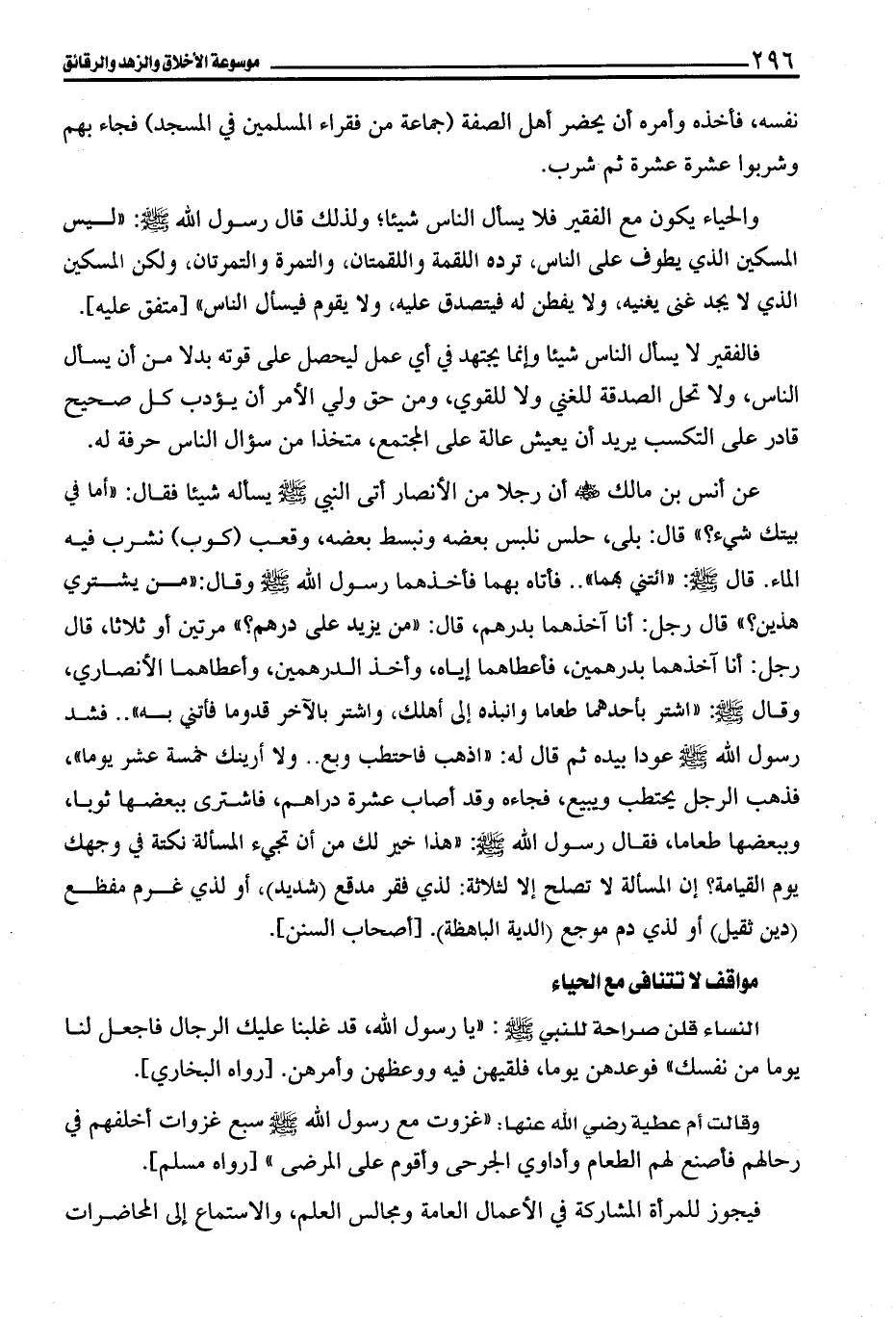 عن أنس بن مالك - رضي الله عنه - أن رجلا من الأنصار أتى النبي - صلى الله عليه وسلم - يسأله شيئا فقال: "أما في بيتك شيء؟ " قال: بلى، حلس نلبس بعضه ونبسط بعضه، وقعب (كوب) نشرب فيه الماء. قال - صلى الله عليه وسلم -:" ائتني بهما" .. فأتاه بهما فأخذهما رسول الله - صلى الله عليه وسلم - وقال: من يشتري هذين؟ قال رجل: أنا آخذهما بدرهم، قال:"من يزيد على درهم؟ " مرتين أو ثلاثا، قال رجل: أنا آخذهما بدرهمين، فأعطاهما إياه، وأخذ الدرهمين، وأعطاهما الأنصاري، وقال - صلى الله عليه وسلم -:"اشتر بأحدهما طعاما وانبذه إلى أهلك، واشتر بالآخر قدوما فأتني به" .. فشد رسول الله - صلى الله عليه وسلم - عودا بيده ثم قال له: "اذهب فاحتطب وبع .. ولا أرينك خمسة عشر يوما"، فذهب الرجل يحتطب ويبيع، فجاءه وقد أصاب عشرة دراهم، فاشترى ببعضها ثوبا، وببعضها طعاما، فقال رسول الله - صلى الله عليه وسلم -:"هذا خير لك من أن تجيء المسألة نكتة في وجهك يوم القيامة؟ إن المسألة لا تصلح إلا لثلاثة: لذي فقر مدقع (شديد)، أو لذي غرم مفظع (دين ثقيل) أو لذي دم موجع (الدية الباهظة). [أصحاب السنن].