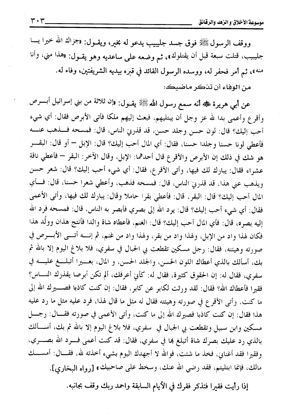 عن أبي هريرة - رضي الله عنه - أنه سمع رسول الله - صلى الله عليه وسلم - يقول: "إن ثلاثة من بني إسرائيل أبرص وأقرع وأعمى بدا لله عز وجل أن يبتليهم، فبعث إليهم ملكا فأتى الأبرص فقال: أي شيء أحب إليك؟ قال: لون حسن وجلد حسن، قد قذرني الناس، قال: فمسحه فذهب عنه فأعطي لونا حسنا وجلدا حسنا، فقال: أي المال أحب إليك؟ قال: الإبل -أو قال: البقر هو شك في ذلك إن الأبرص والأقرع قال أحدهما: الإبل، وقال الآخ: البقر- فأعطي ناقة عشراء فقال: يبارك لك فيها، وأتى الأقرع، فقال: أي شيء أحب إليك؟ قال: شعر حسن ويذهب عني هذا قد قذرني الناس، قال: فمسحه فذهب، وأعطي شعرا حسنا، قال: فأي المال أحب اليك؟ قال: البقر، قال: فأعطي بقرا حاملا وقال: يبارك لك فيها، وأتى الأعمى فقال: أي شىء أحب إليك؟ قال: يرد الله إلى بصري فأبصر به الناس، قال: فمسحه فرد الله إليه بصره، قال: فأي المال أحب إليك؟ قال: الغنم، فأعطاه شاة والدا فأنتج هذان وولَّد هذا فكان لهذا واد من الإبل، ولهذا واد من بقر، ولهذا واد من غنم، ثم إنه أتى الأبرص في صورته وهيئته، فقال: رجل مسكين تقطعت بي الجبال في سفري، فلا بلاغ اليوم إلا بالله ثم بك، أسألك بالذي أعطاك اللون الحسن، والجلد الحسن، والمال، بعيرا أتبلغ عليه في سفري، فقال له: إن الحقوق كثيرة، فقال له: كأني أعرفك، ألم تكن أبرصا يقذرك الناس؟ فقيرا فأعطاك الله؟ فقال: لقد ورثت لكابر عن كابر، فقال: إن كنت كاذبا فصيرك الله إلى ما كنت، وأتى الأقرع في عورته وهيئته فقال له مثل ما قال لهذا، فرد عليه مثل ما رد عليه هذا فقال: إن كنت كاذبا فصيرك الله إلى ما كنت، وأتى الأعمى في صورته فقال: رجل مسكين وابن سبيل وتقطعت بي الجبال في سفري، فلا بلاغ اليوم إلا بالله ثم بك، أسألك بالذي رد عليك بصرك شاة أتبلغ بها في سفري، فقال: قد كنت أعمى فرد الله بصري، وفقيرا فقد أغناني، فخذ ما شئت، فوالله لا أجهدك اليوم بشىء أخذته لله، فقال: أمسك مالك، فإنما ابتليتم، فقد رضي الله عنك، وسخط على صاحبيك" [رواه البخاري].