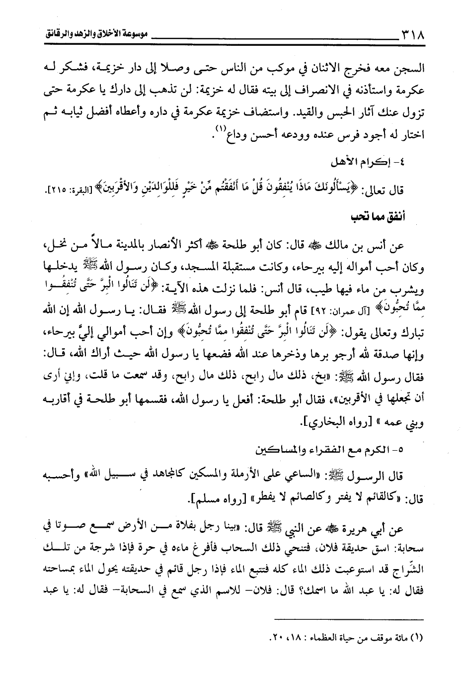 عن أنس بن مالك - رضي الله عنه - قال: كان أبو طلحة - رضي الله عنه - أكثر الأنصار بالمدينة مالاً من نخل، وكان أحب أمواله إليه بيرحاء، وكانت مستقبلة المسجد، وكان رسول الله - صلى الله عليه وسلم - يدخلها ويشرب من ماء فيها طيب، قال أنس: فلما نزلت هذه الآية: {لَنْ تَنَالُوا الْبِرَّ حَتَّى تُنْفِقُوا مِمَّا تُحِبُّونَ} [آل عمران: 92] قام أبو طلحة إلى رسول الله - صلى الله عليه وسلم - فقال: يا رسول الله إن الله تبارك وتعالى يقول: {لَنْ تَنَالُوا الْبِرَّ حَتَّى تُنْفِقُوا مِمَّا تُحِبُّونَ} [آل عمران: 92] وإن أحب أموالي إلي بيرحاء، وإنها صدقة لله أرجو برها وذخرها عند الله فضعها يا رسول الله حيث أراك الله، قال: فقال رسول الله - صلى الله عليه وسلم -:"بخ، ذلك مال رابح، ذلك مال رابح، وقد سمعت ما قلت، وإني أرى أن تجعلها في الأقربين"، فقال أبو طلحة: أفعل يا رسول الله، فقسمها أبو طلحة في أقاربه وبني عمه" [رواه البخاري].