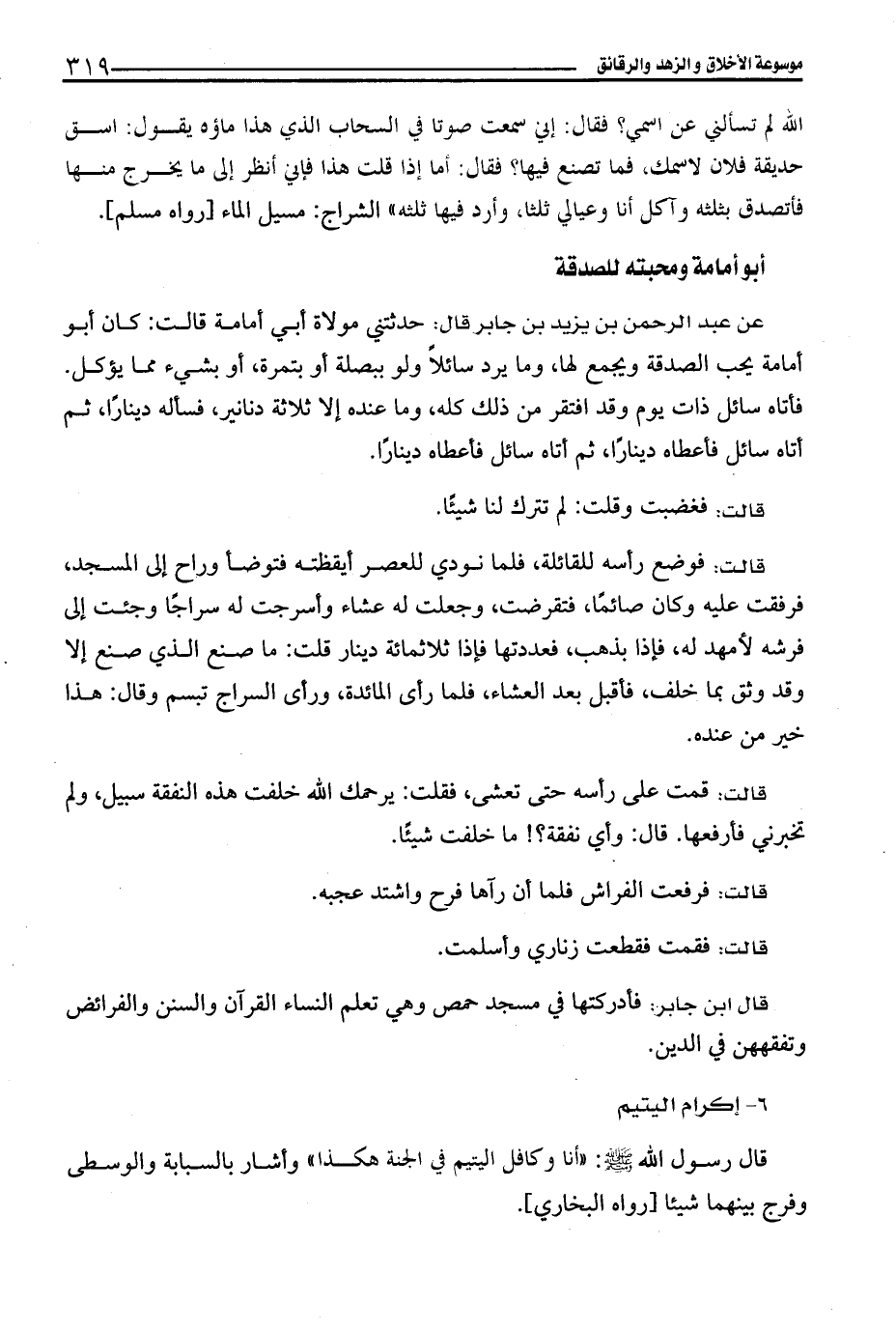 عن عبد الرحمن بن يزيد بن جابر قال: حدثتني مولاة أبي أمامة قالت: كان أبو أمامة يحب الصدقة ويجمع لها، وما يرد سائلاً ولو ببصلة أو بتمرة، أو بشيء مما يؤكل.