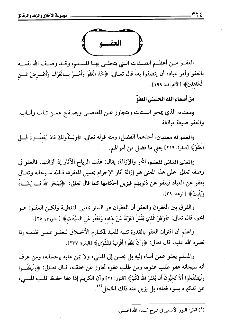 العفو من أعظم الصفات التي يتحلى بها المسلم، وقد وصف الله نفسه بالعفو وأمر عباده أن يتصفوا به، قال تعالى: {خُذِ الْعَفْوَ وَأْمُرْ بِالْعُرْفِ وَأَعْرِضْ عَنِ الْجَاهِلِينَ} [الأعراف: 199].