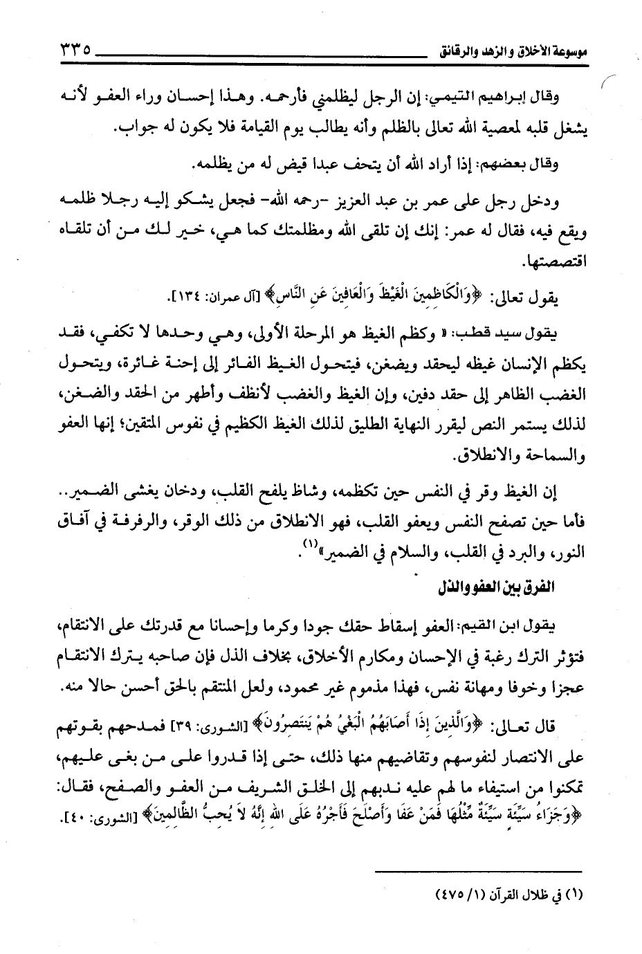 وقال إبراهيم التيمي: إن الرجل ليظلمني فأرحمه. وهذا إحسان وراء العفو لأنه يشغل قلبه لمعصية الله تعالى بالظلم وأنه يطالب يوم القيامة فلا يكون له جواب.