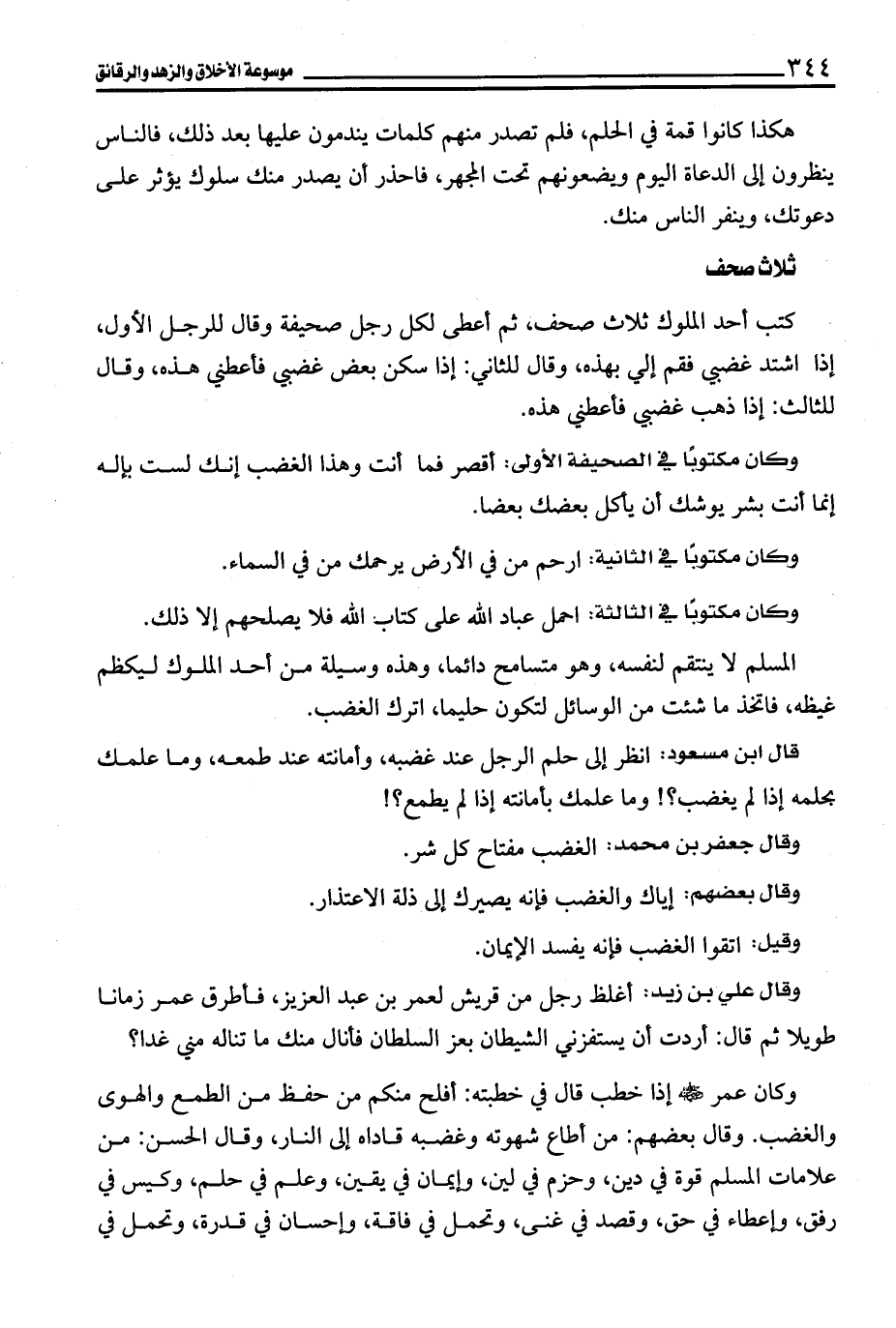 كتب أحد الملوك ثلاث صحف، ثم أعطى لكل رجل صحيفة وقال للرجل الأول، إذا اشتد غضبي فقم إلي بهذه، وقال للثاني: إذا سكن بعض غضبي فأعطني هذه، وقال للثالث: إذا ذهب غضبي فأعطني هذه.